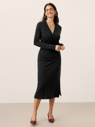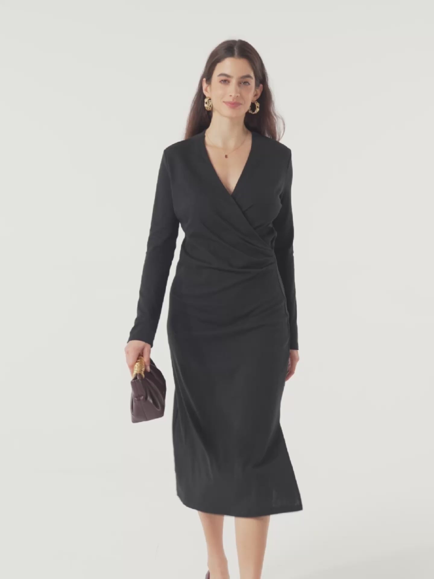 The Linen V-Neck Wrap Dress combines timeless elegance with stretch fabric for a tailored, flattering silhouette.