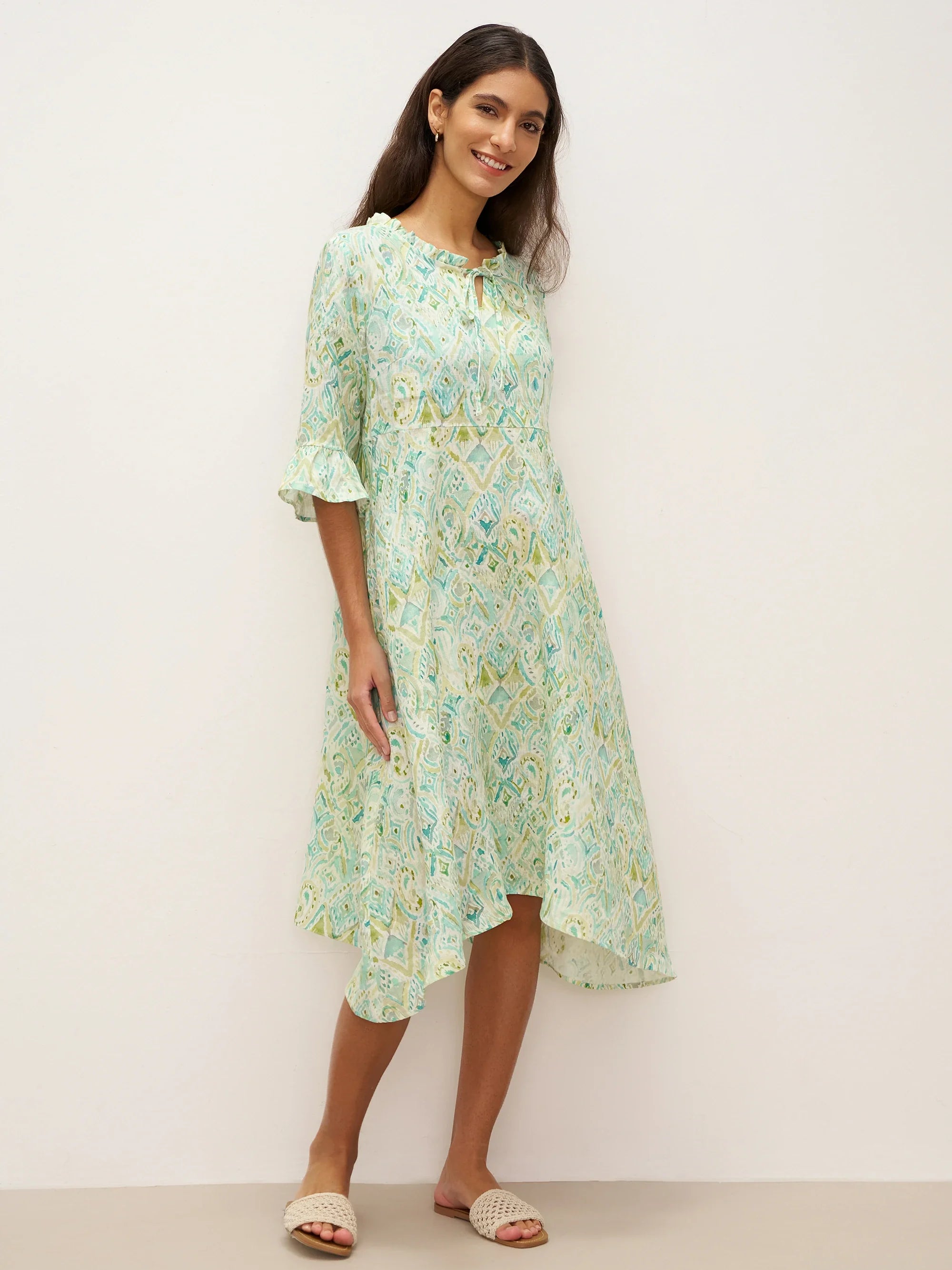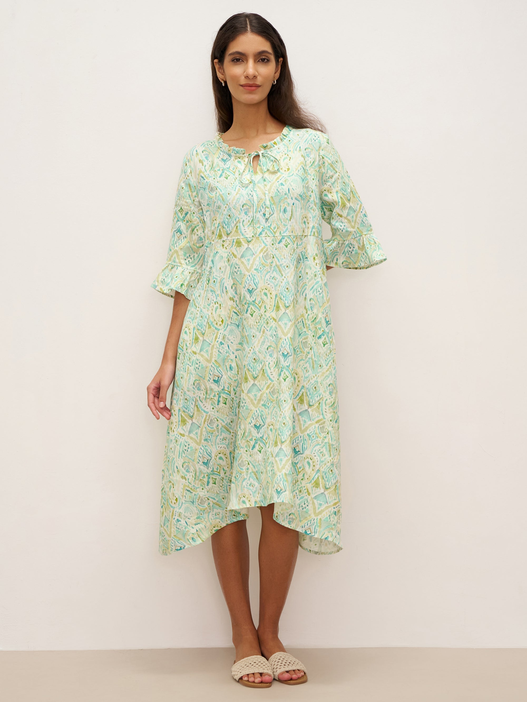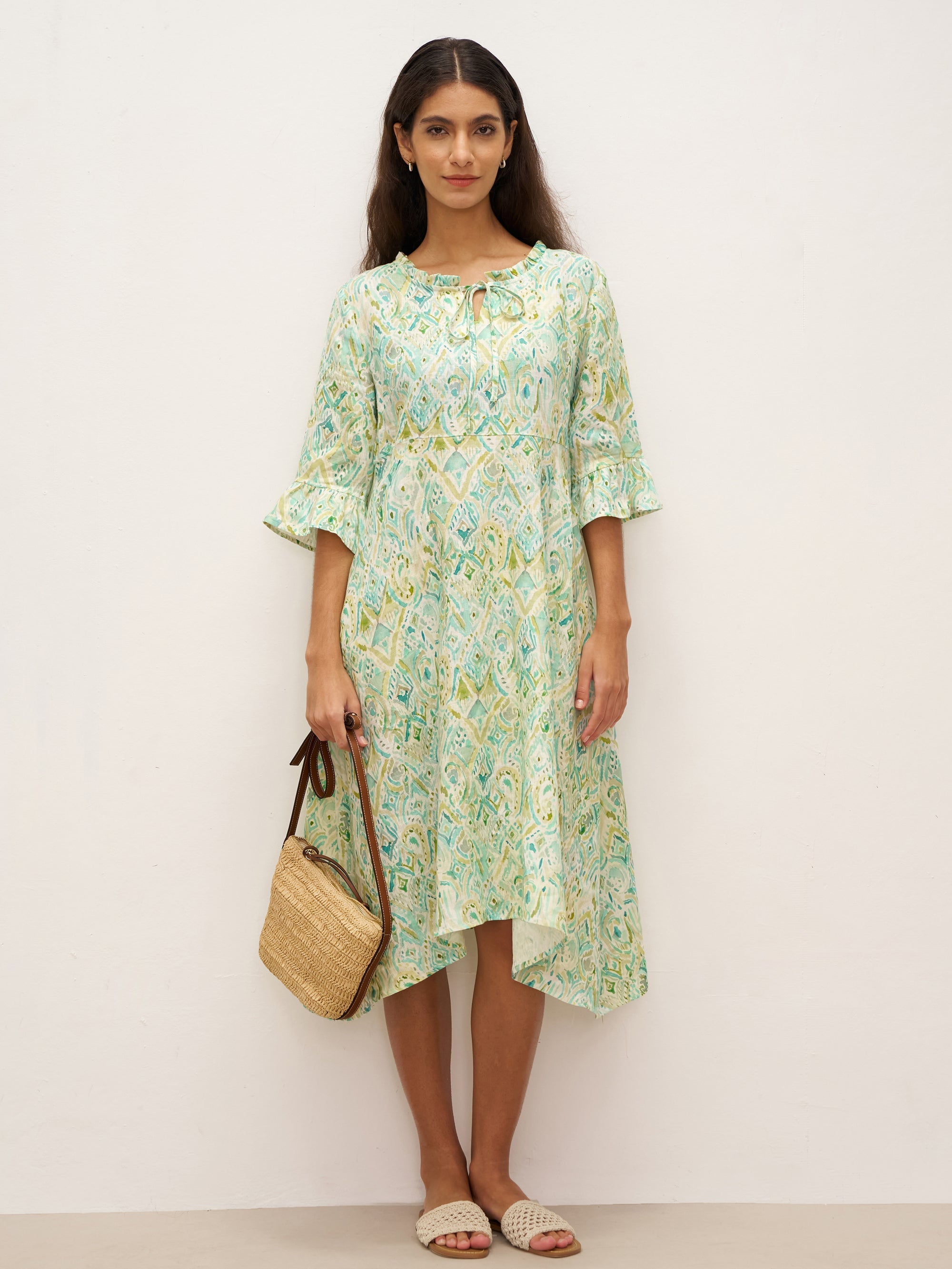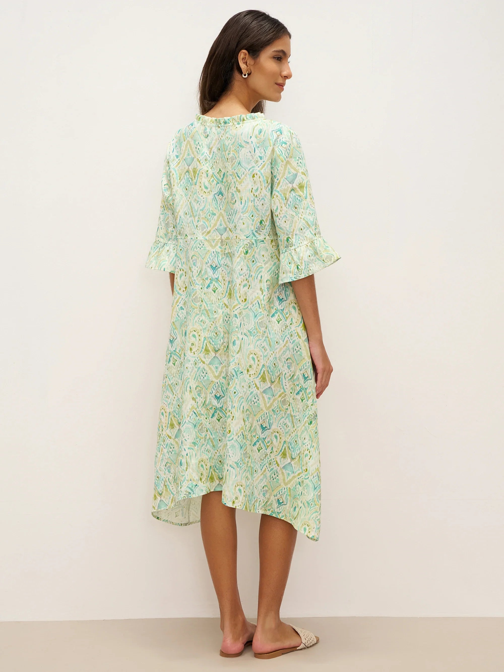 100% Linen A-Line Ruffled Collar Tie-Neck Midi Dress LIVIA