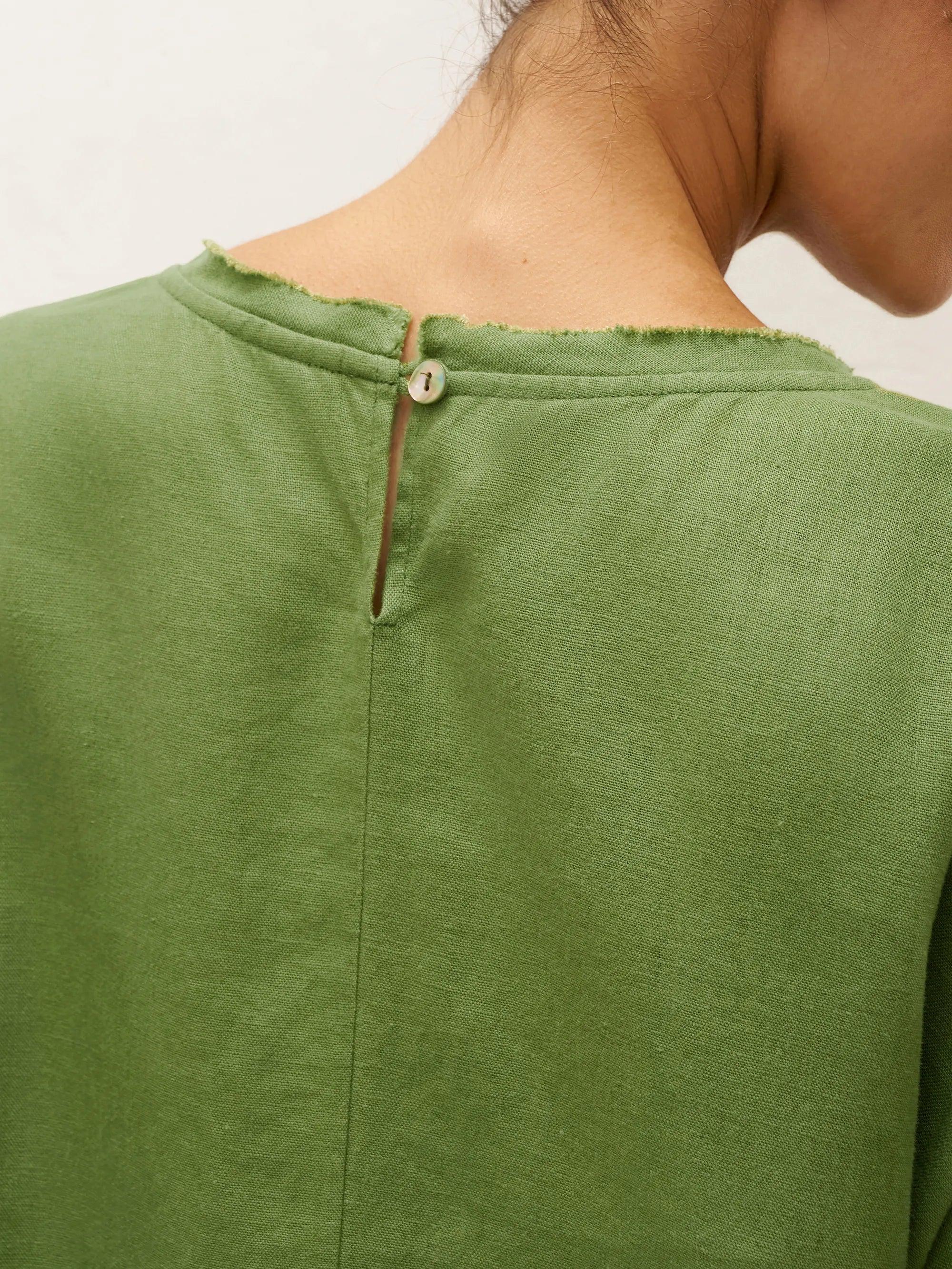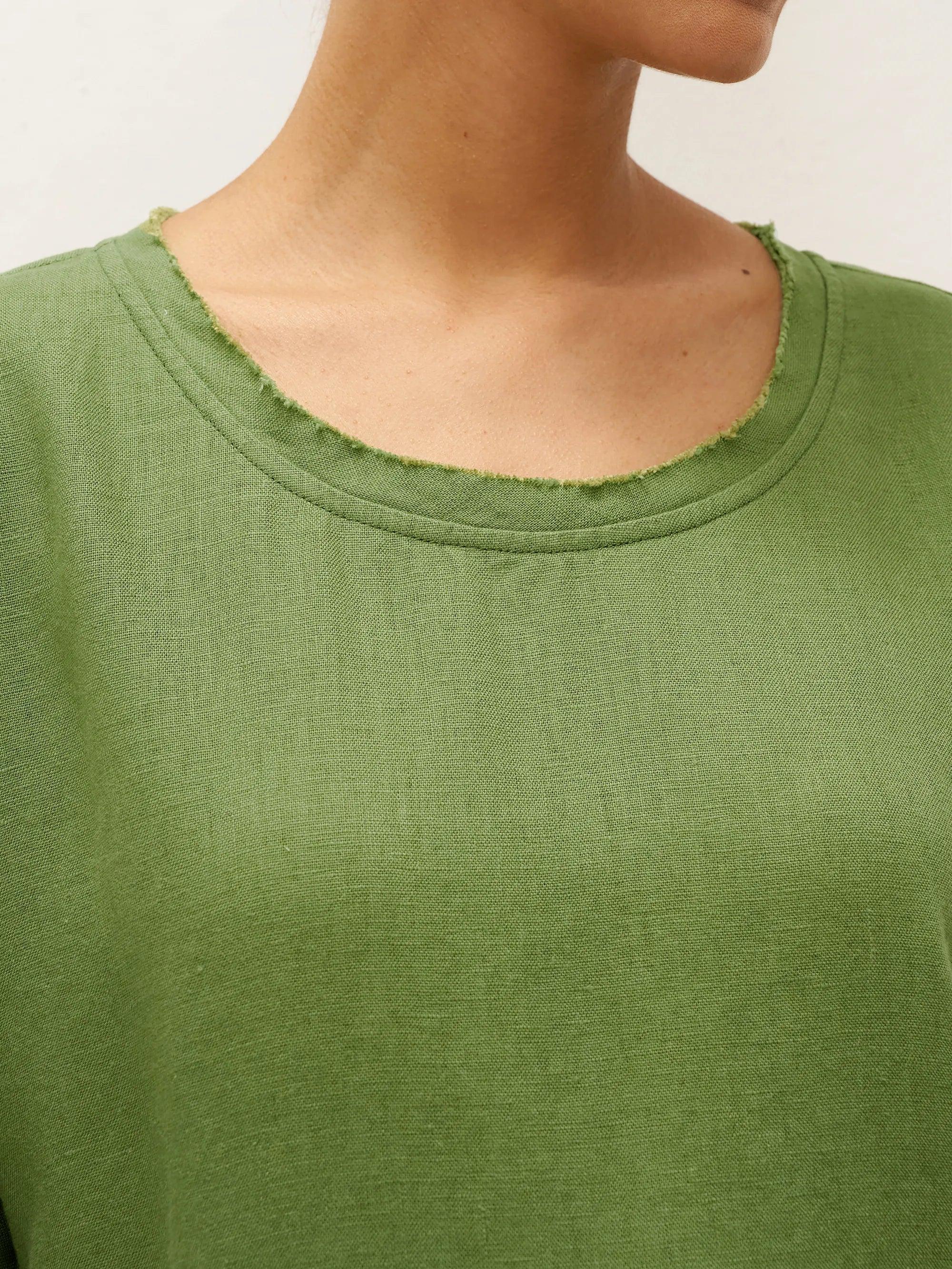 Unique double-layer raw edge neckline design enhances the casual vibe, complemented by the distinctive craftsmanship of the natural fabric.