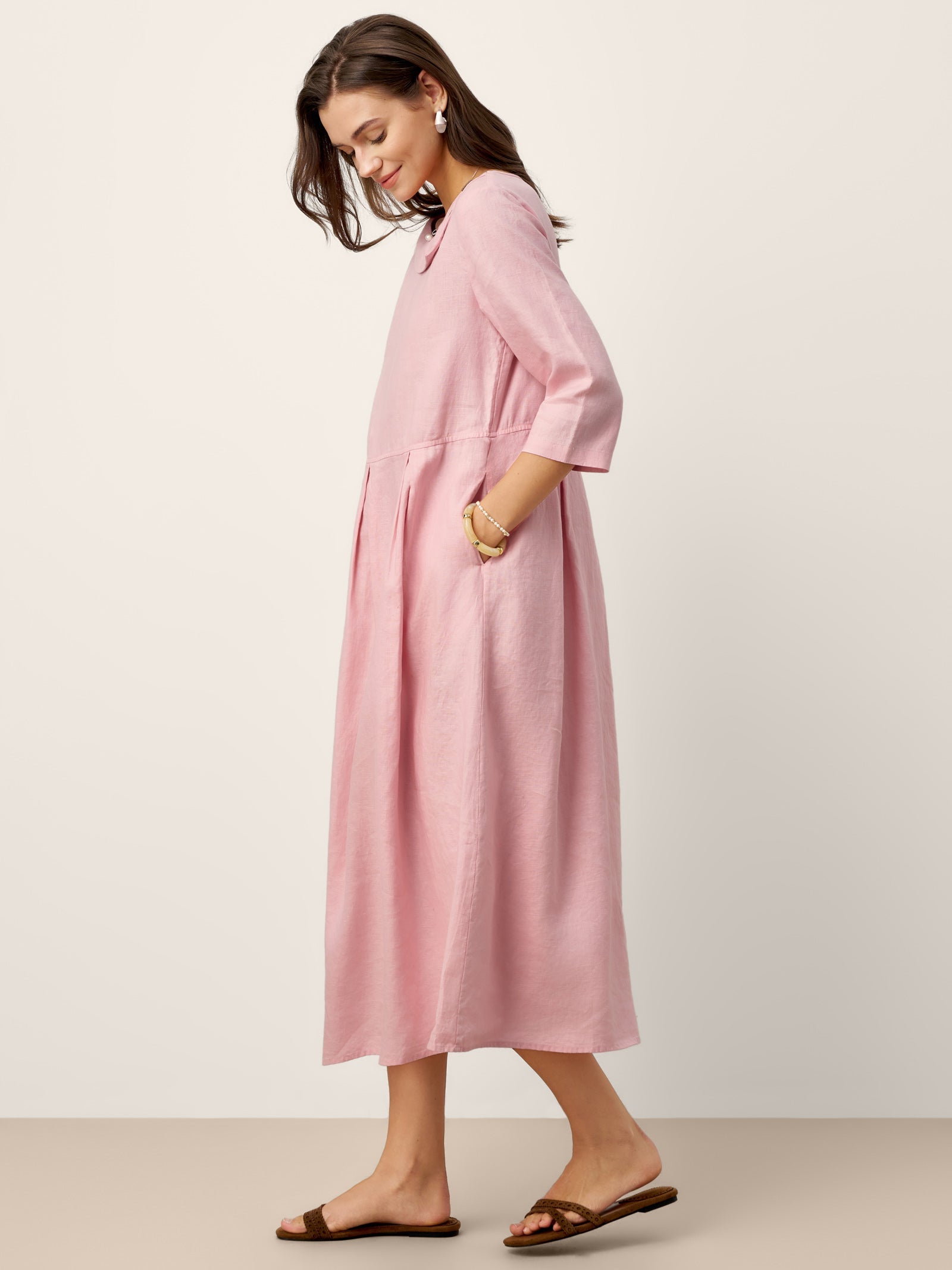 100% Linen Crescent Neck Decorative Button Waist Pleated Maxi Dress GWENYTH