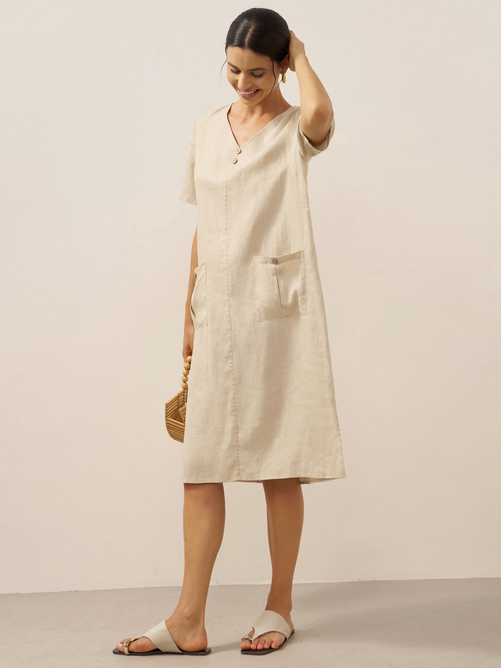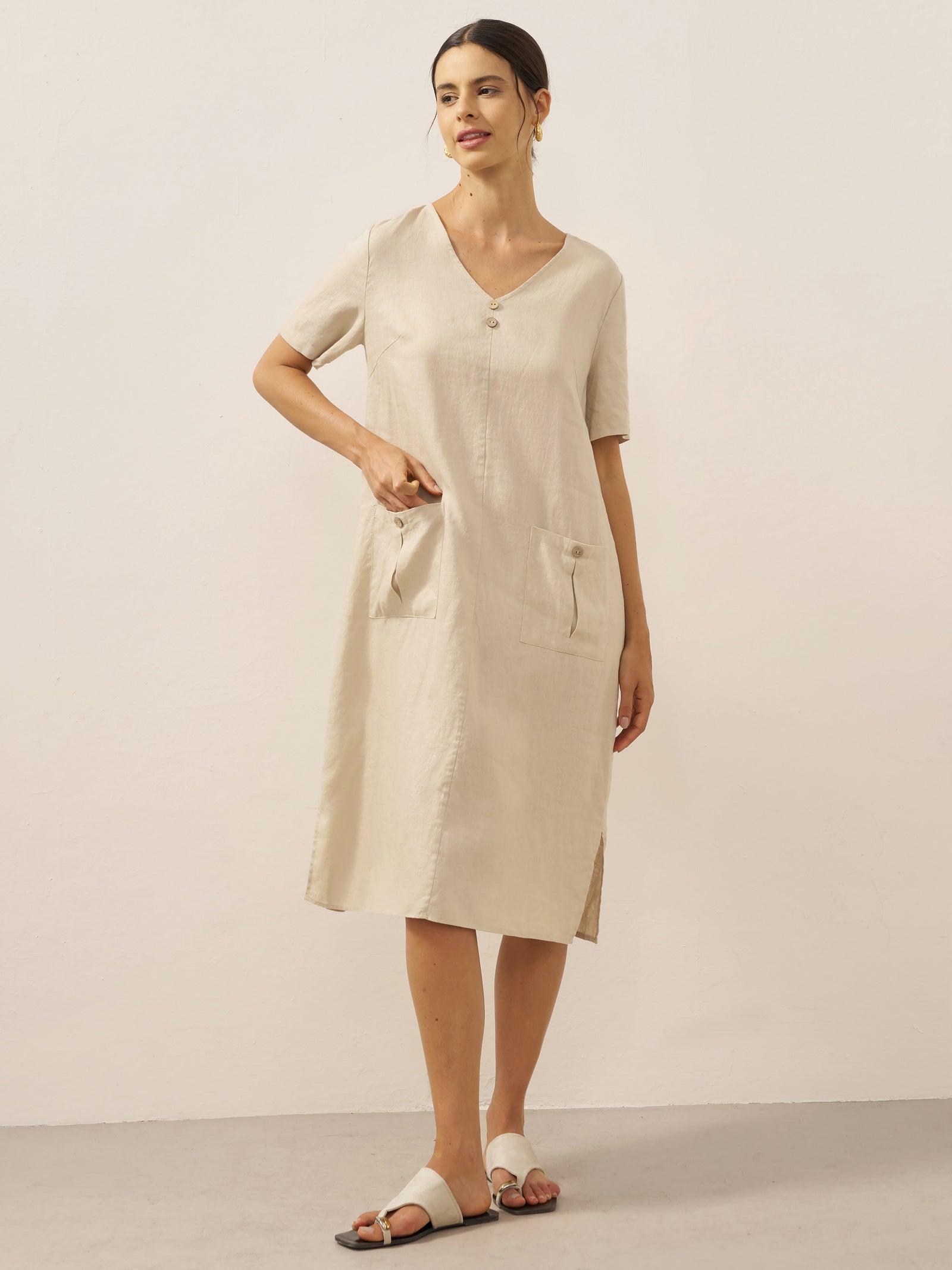 100% Linen Button Front V-Neck Midi Dress NOA