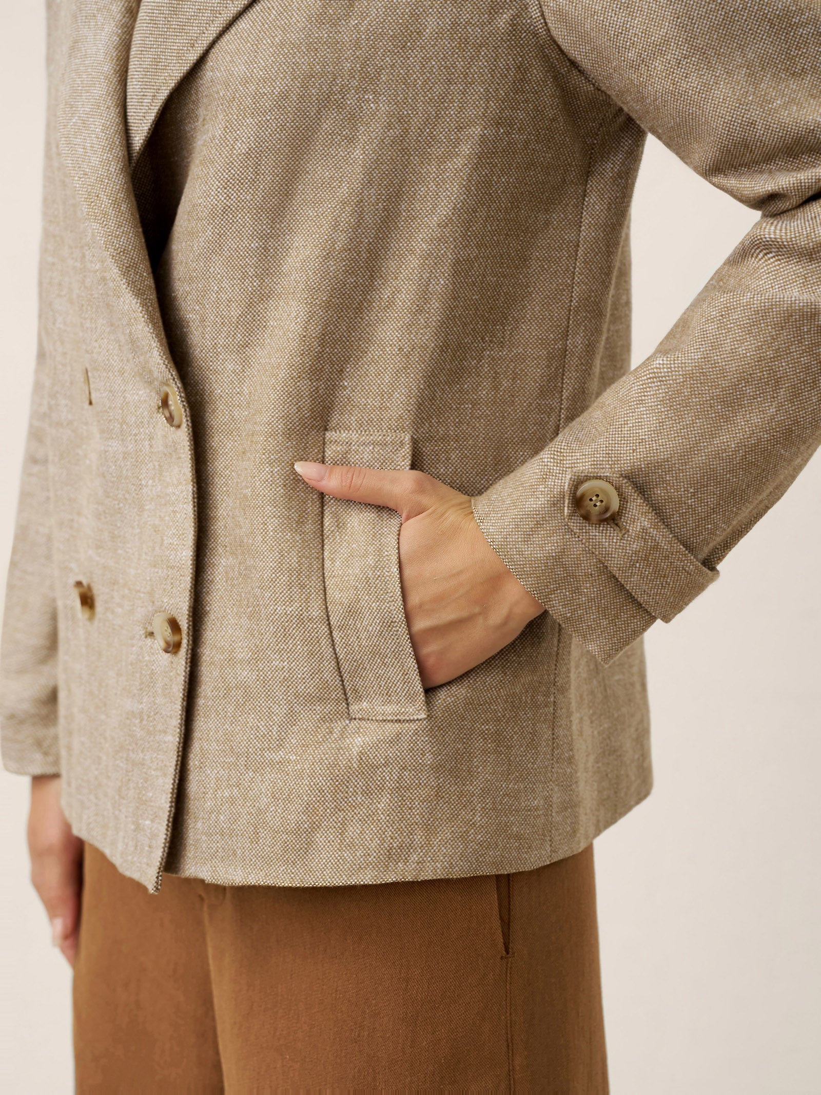 The NAOMI Double-Breasted Linen Blazer offers timeless elegance through heavyweight linen fabric and versatile functional details.