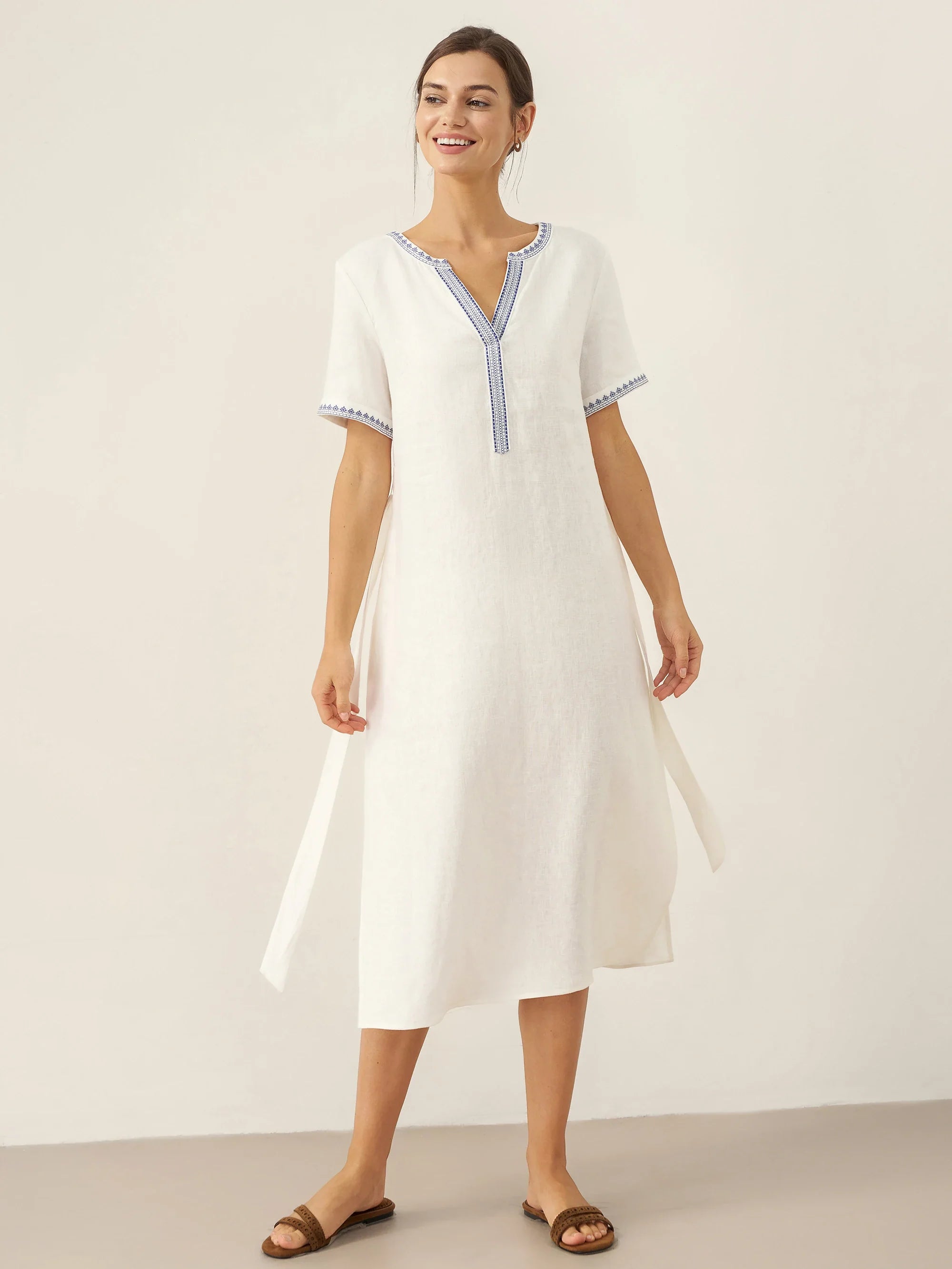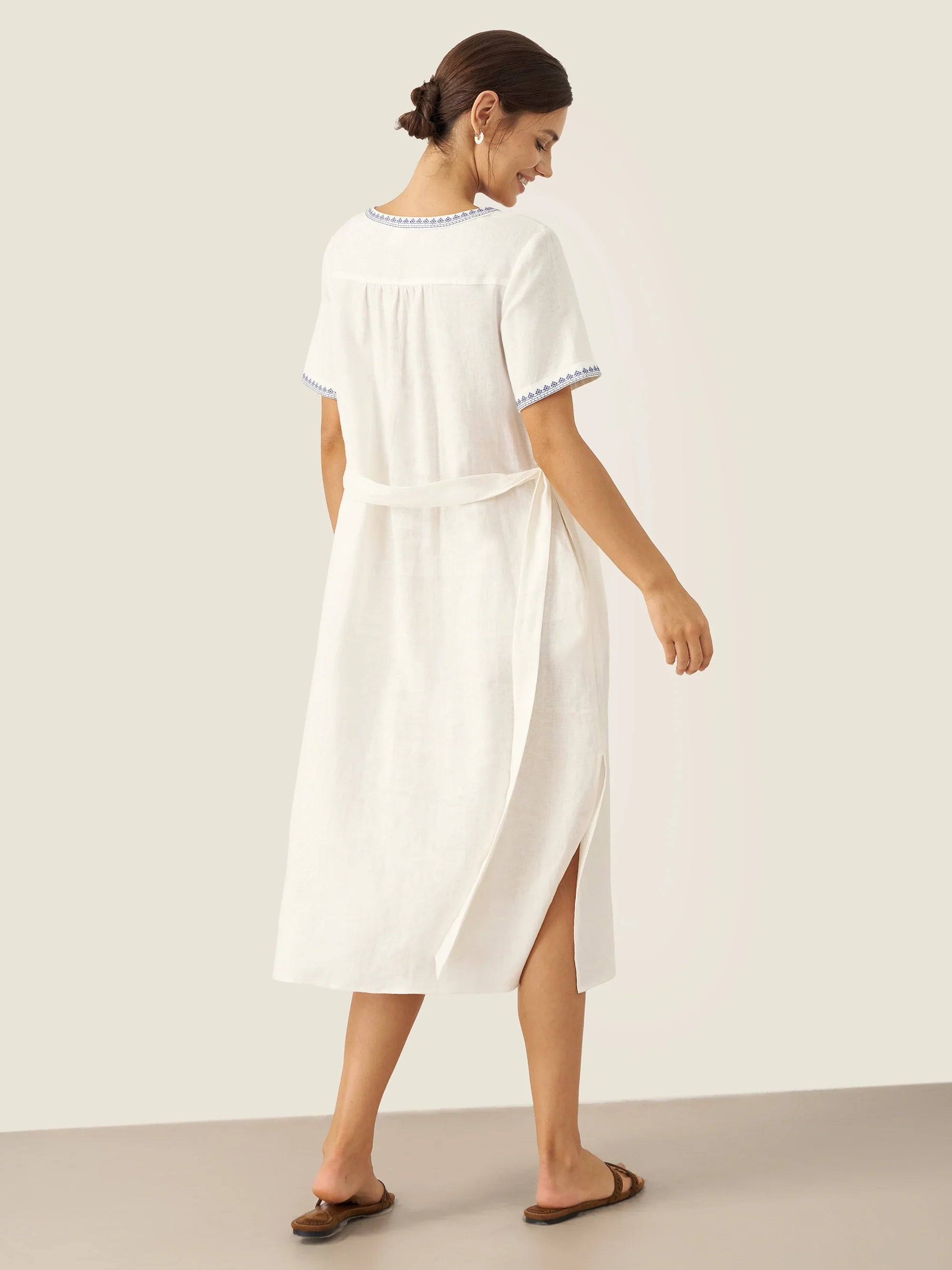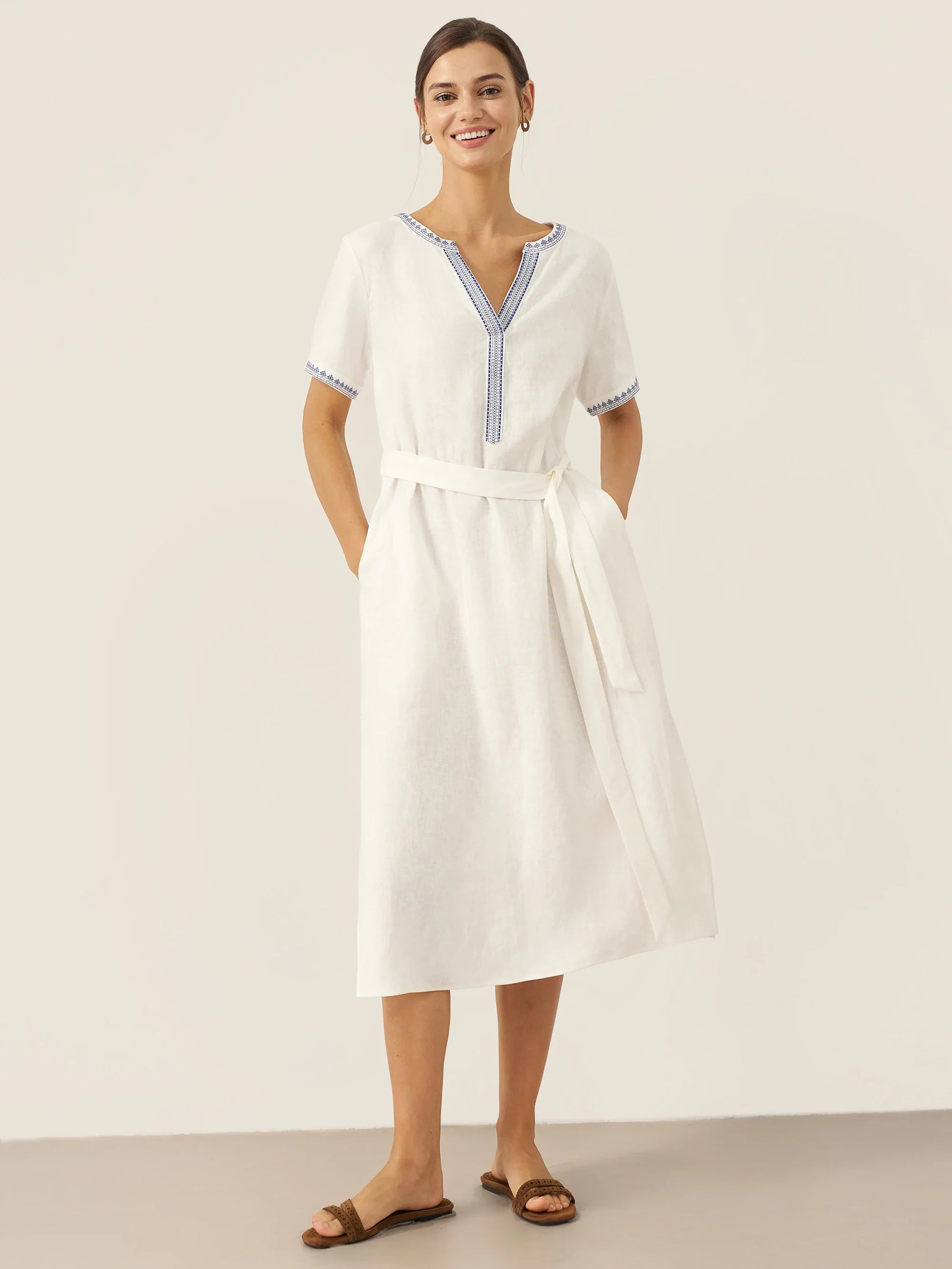 100% Linen Embroidered V-Neck Midi Dress with Belt Fellis