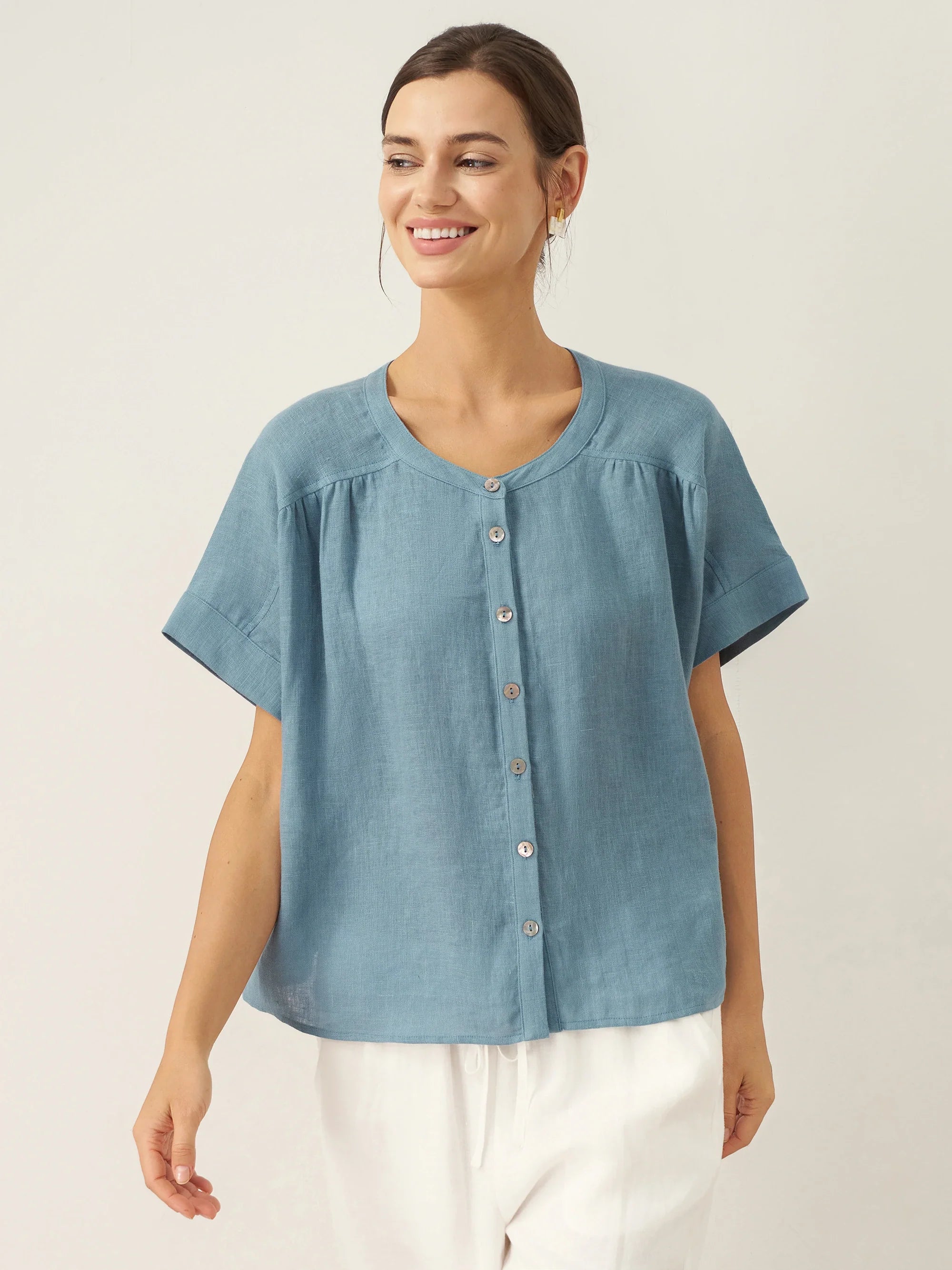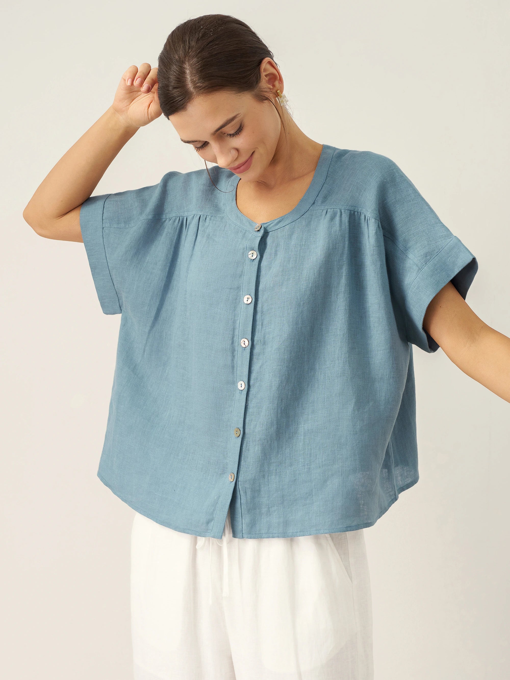 100% Linen Short Sleeve Crew Neck Shirt Fina
