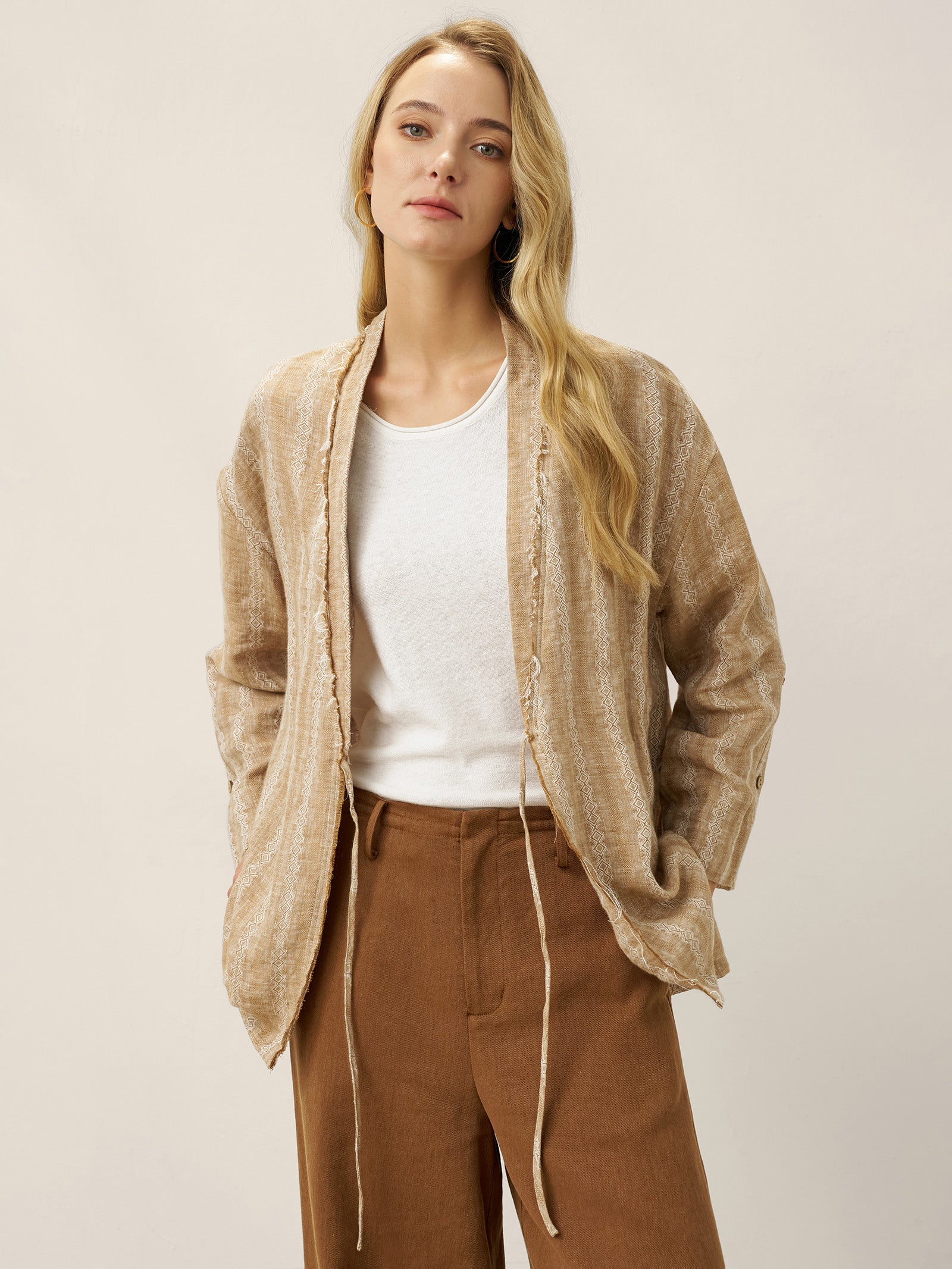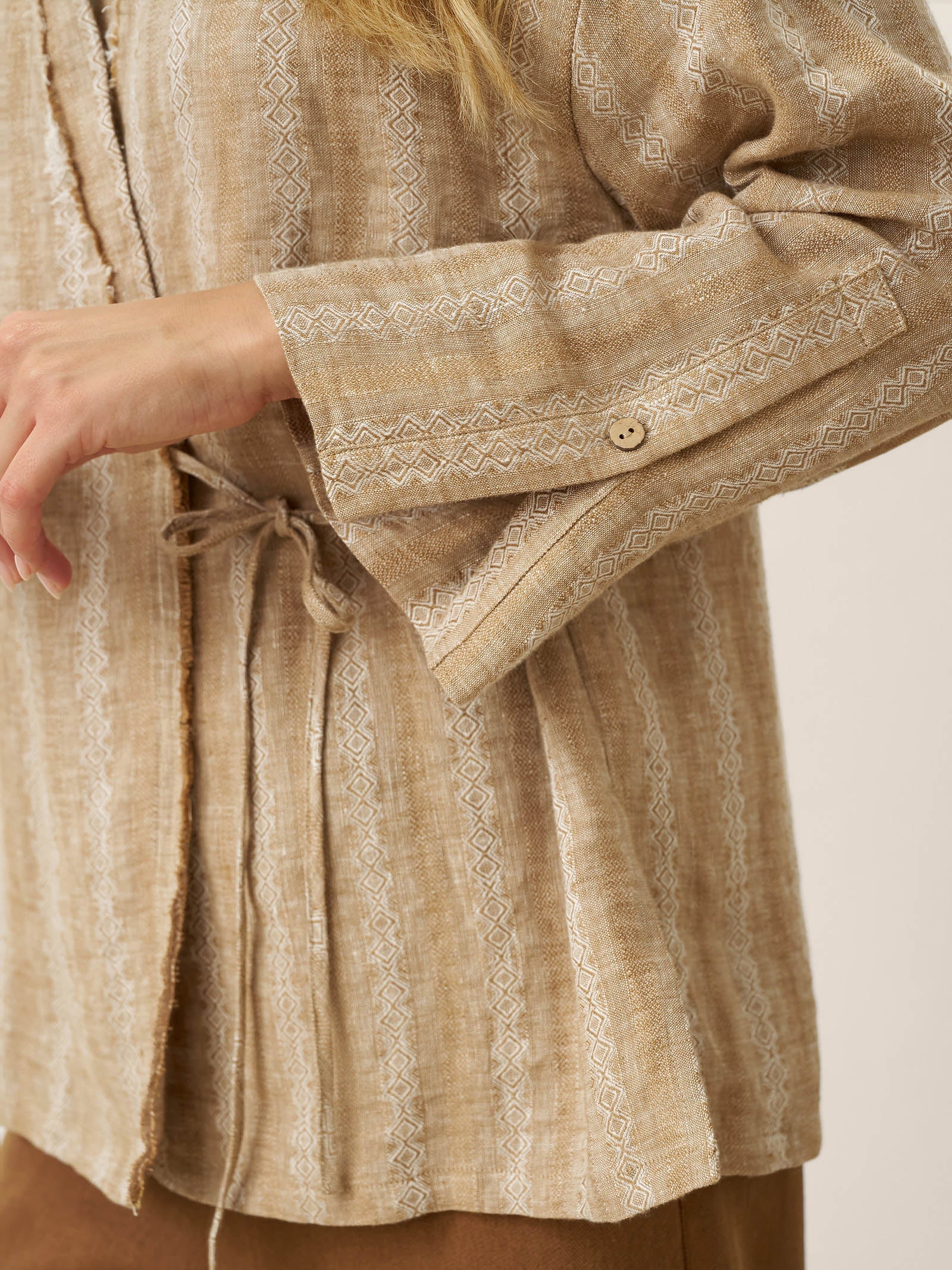 A relaxed linen wrap jacket featuring textured jacquard fabric and artisanal detailing with bohemian-inspired functional elements.