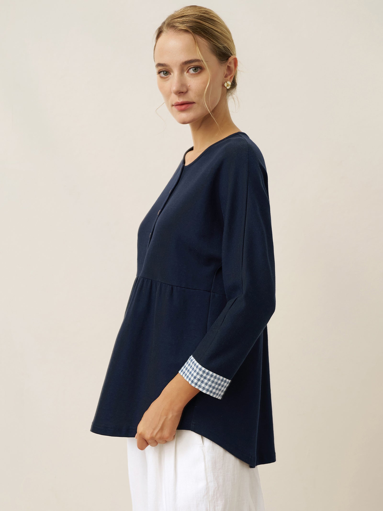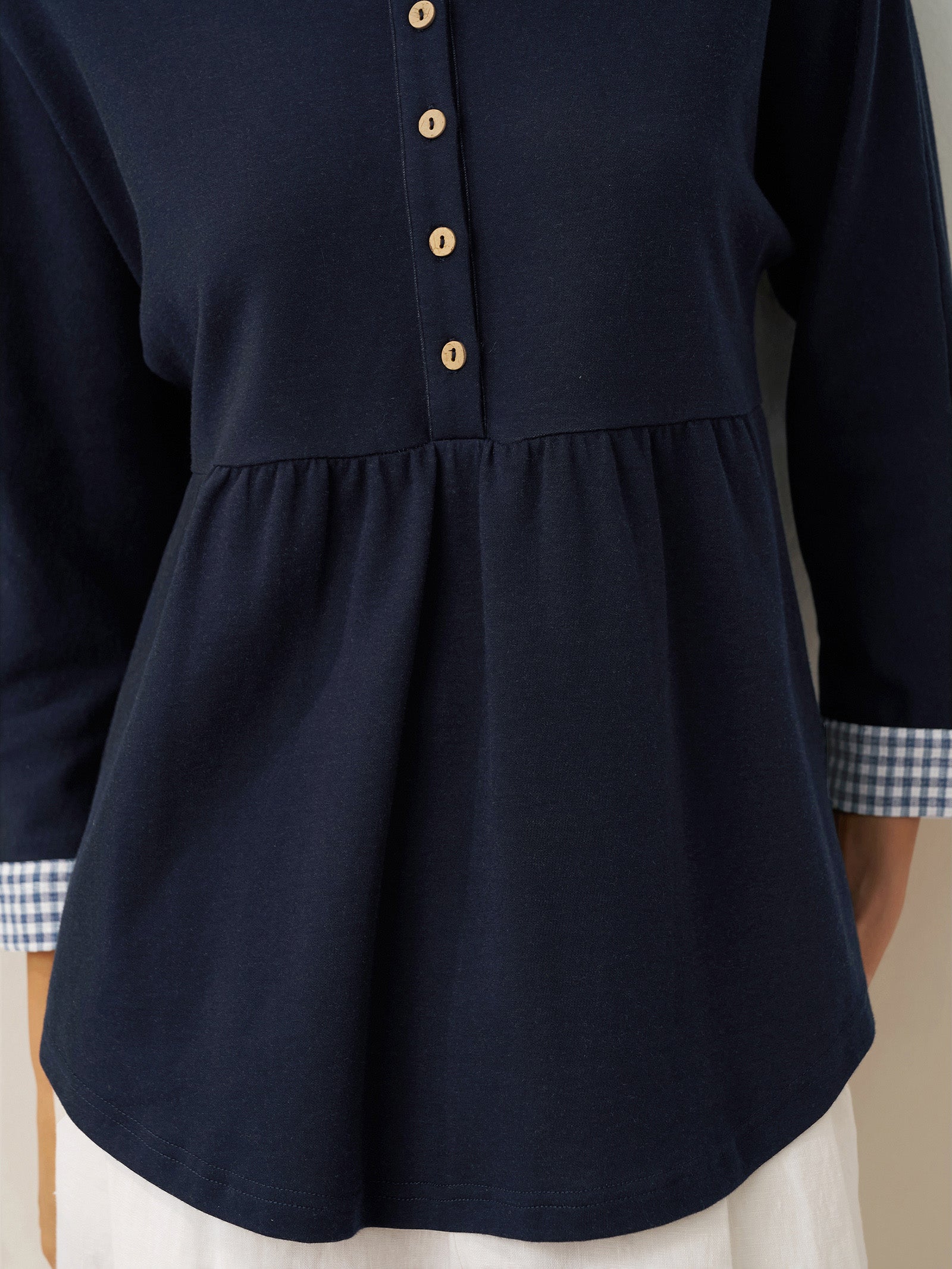 A relaxed-fit jersey top blending A-line structure with artisanal details, featuring coconut shell buttons and contrasting gingham cuffs for effortless polish.