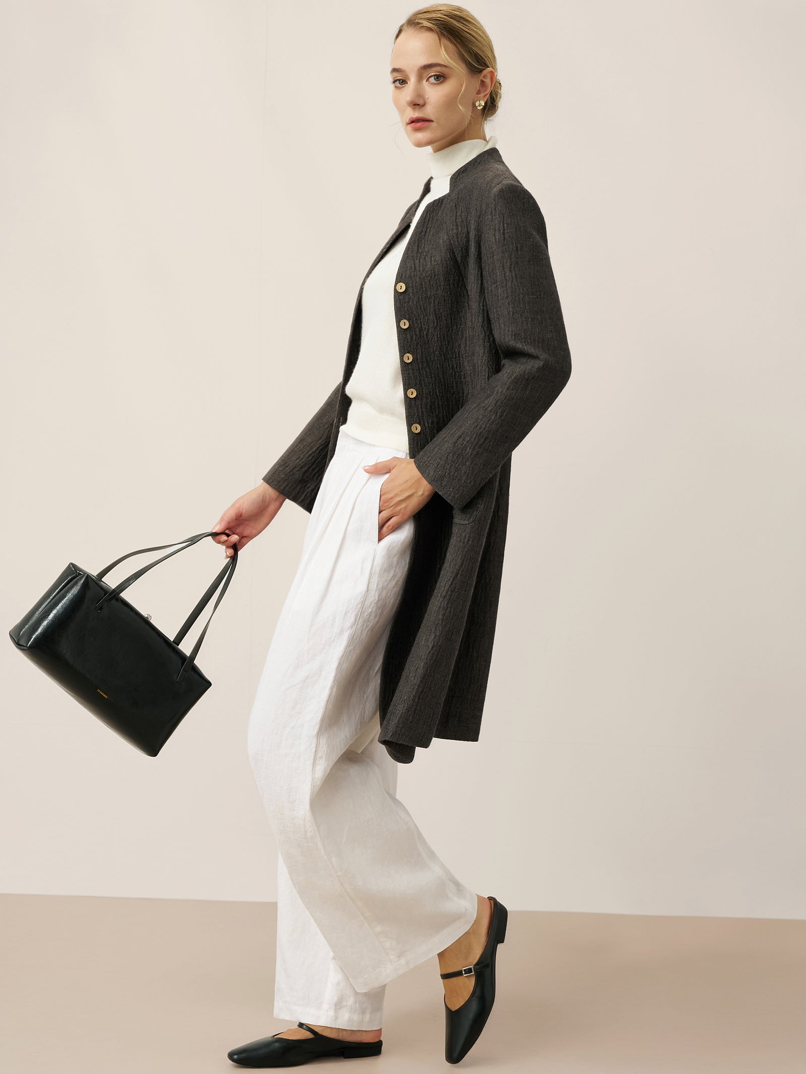 Smoky Quartz Linen Mandarin Collar Long Shirt-Coat blends Eastern-inspired tailoring with contemporary functional design.