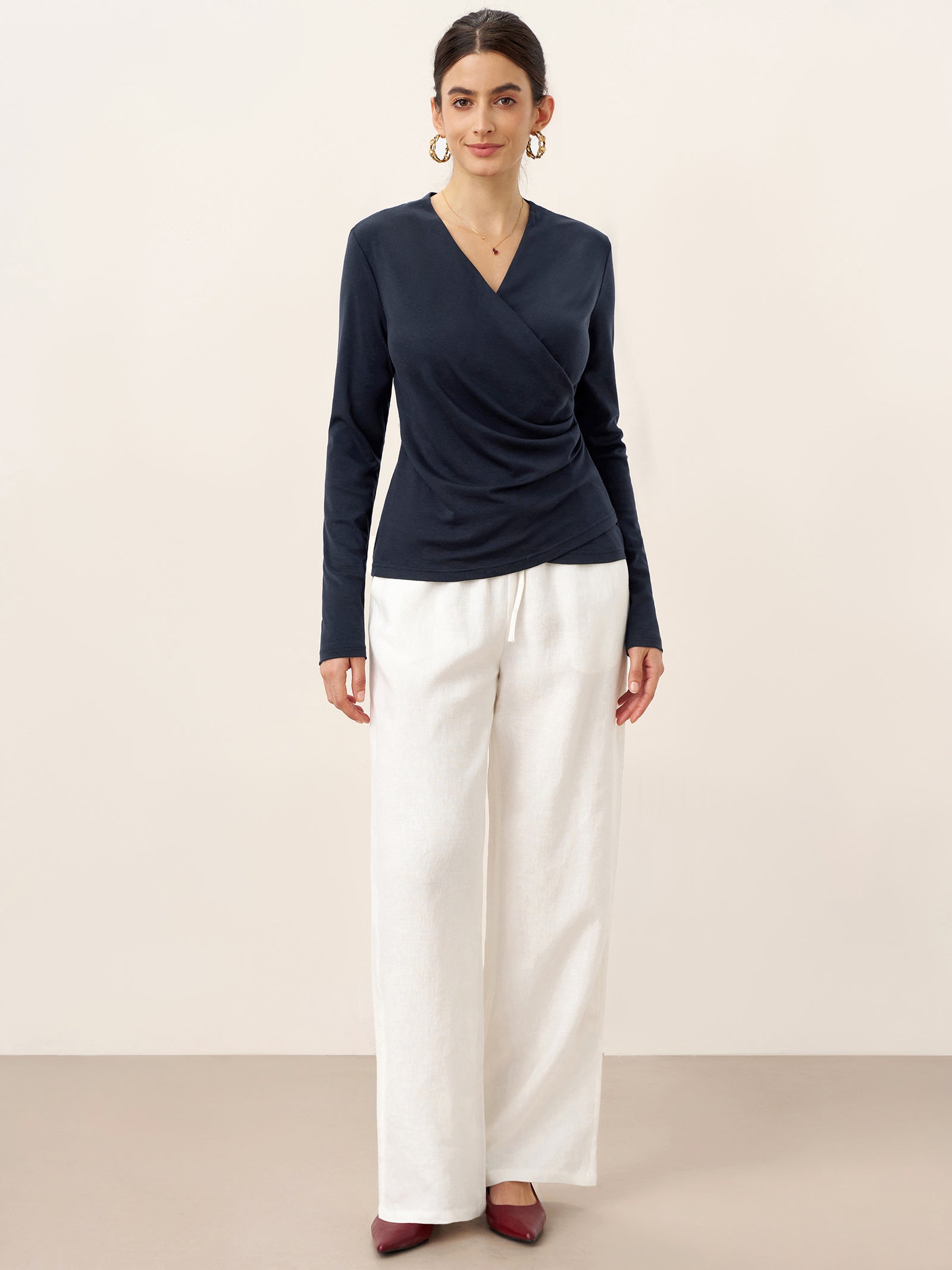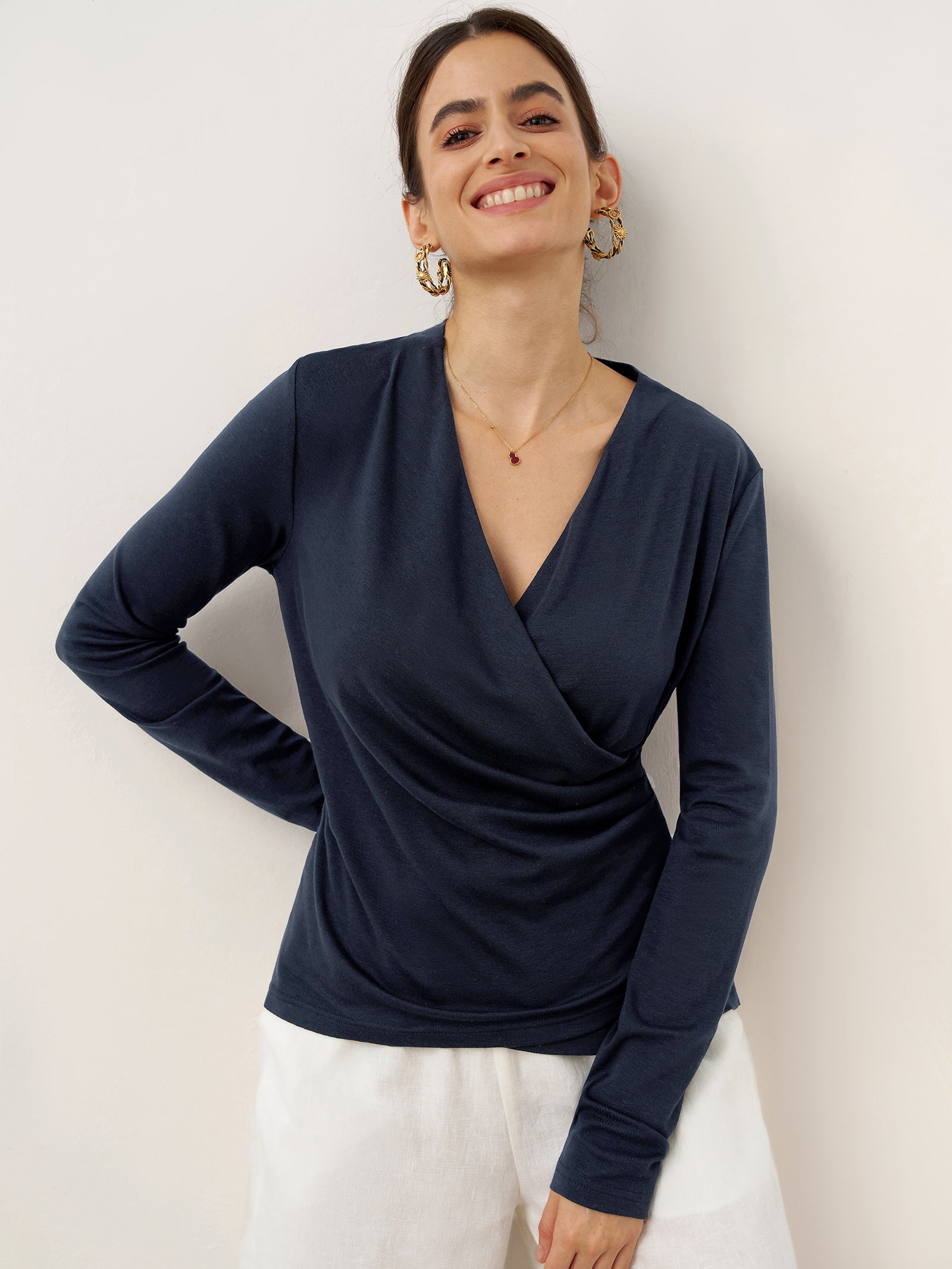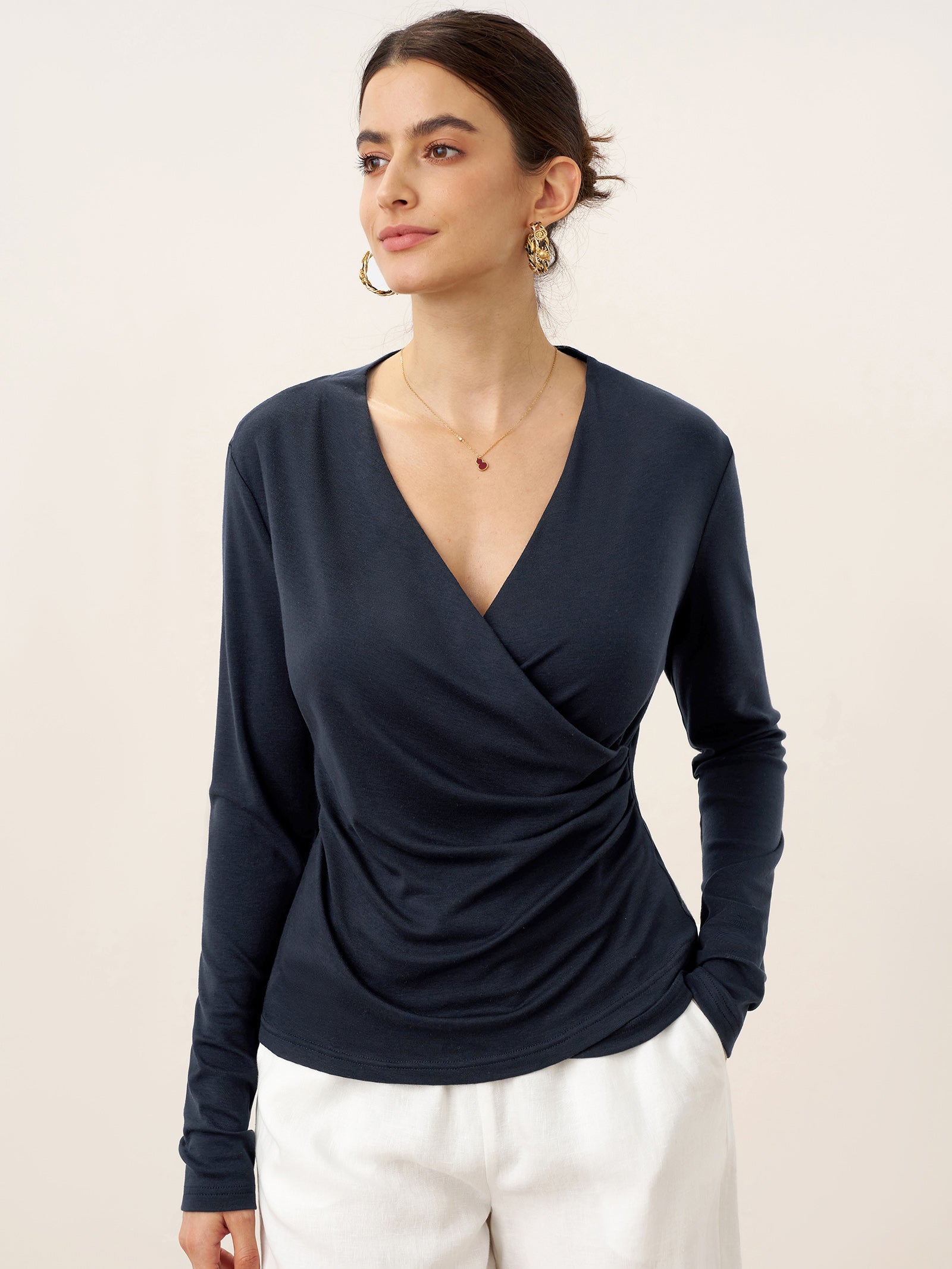 Lyocell Wool Asymmetric Ruched Overlap V-Neck Top TILLY