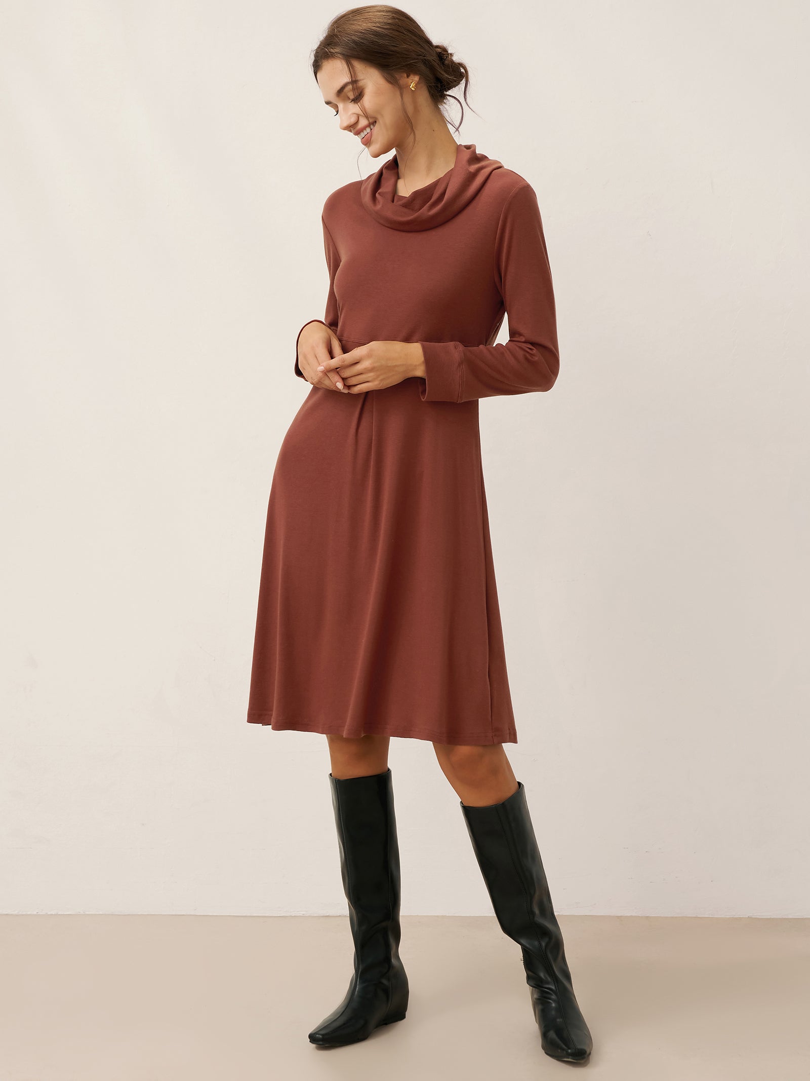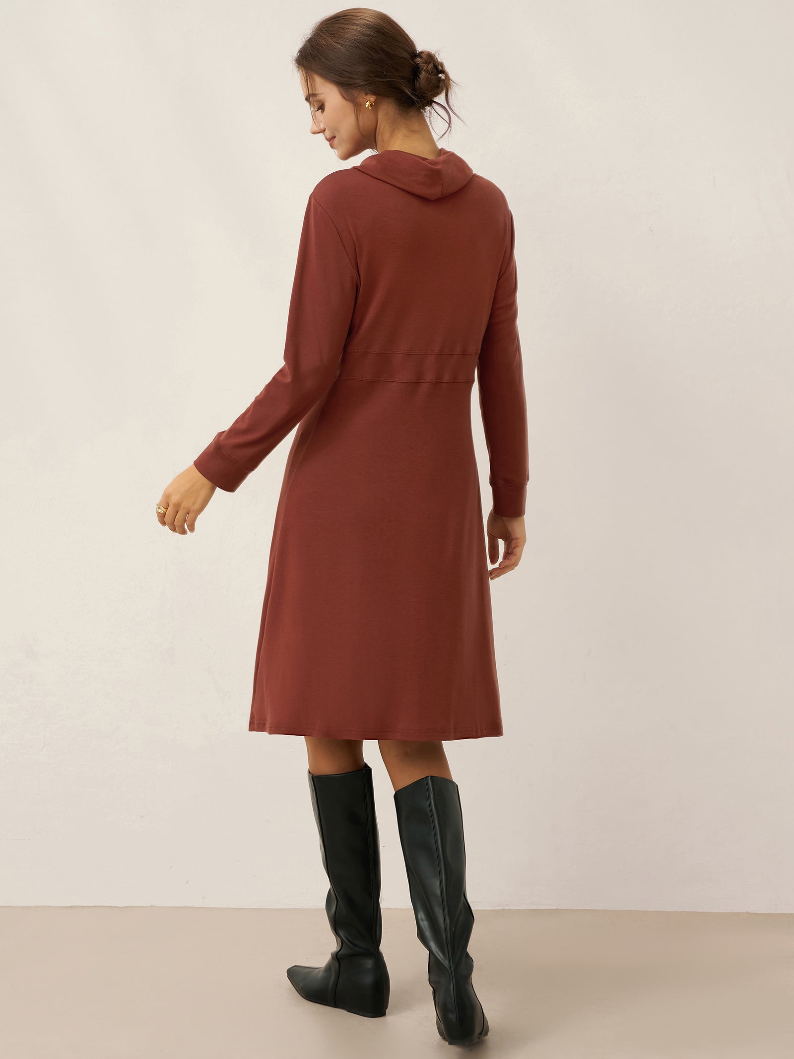 A midi dress crafted from stretchy Tencel Wool with a draped neckline and practical design details, offering warmth and versatility in a maroon hue. Perfect for layering in seasonal transitions or climate-controlled spaces.