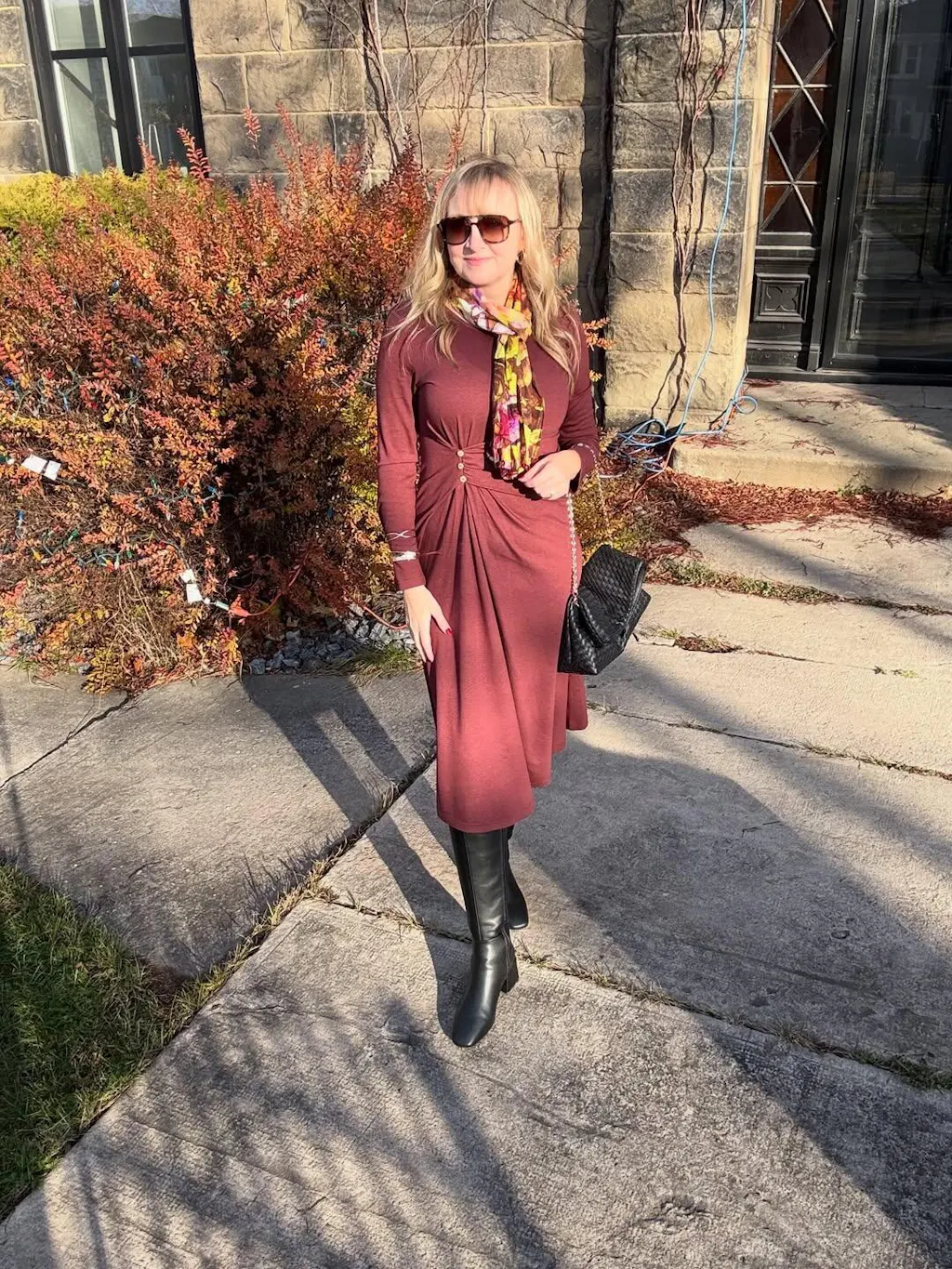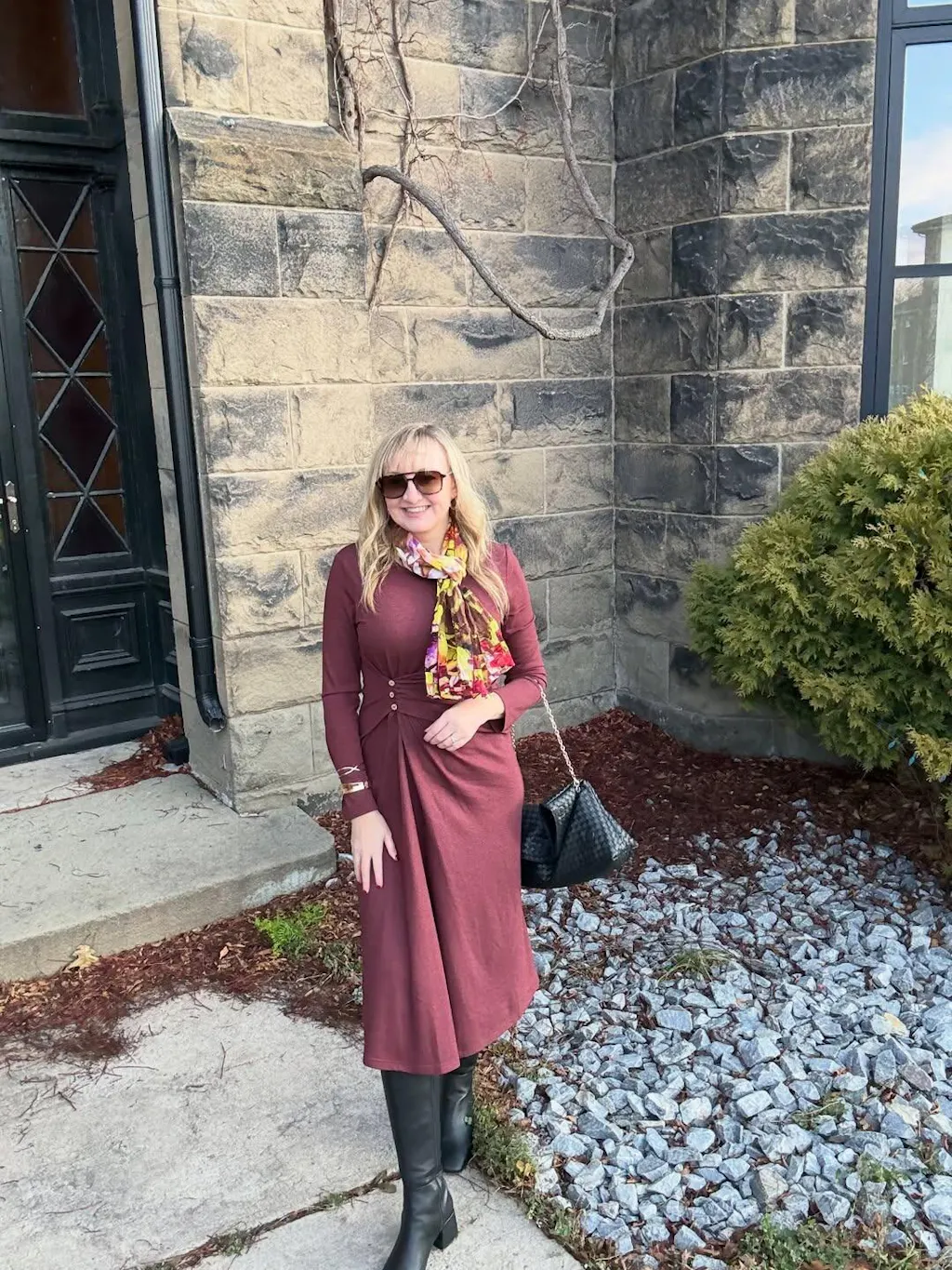 A Lyocell-wool maxi dress featuring asymmetric ruching, eco-friendly coconut buttons, and a versatile design for transitional autumn/winter wear.