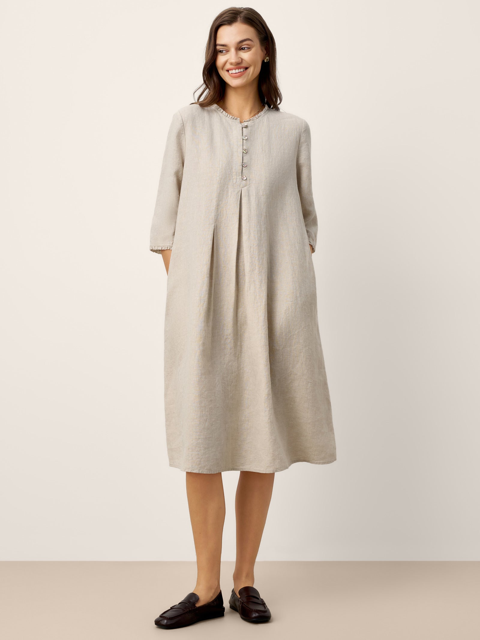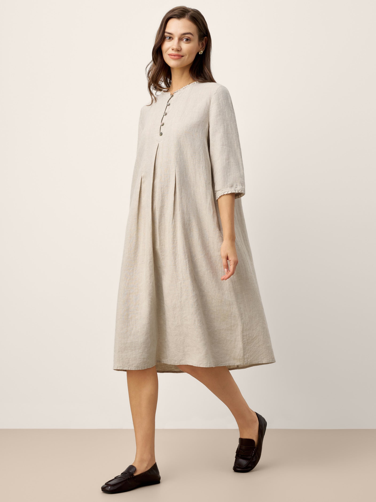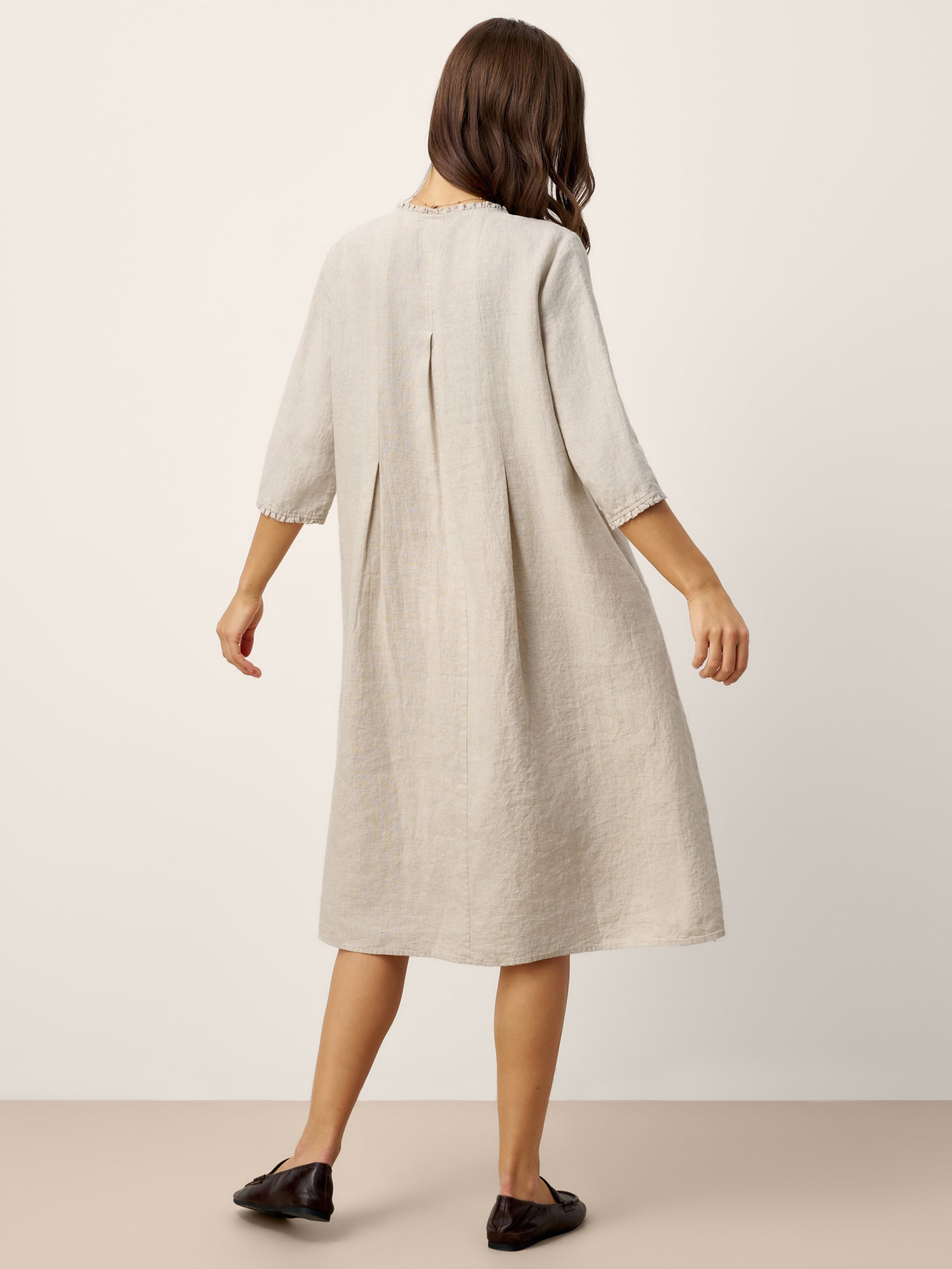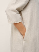 100% Linen Ruffle Trim Inverted Pleat Midi Dress LAVINIA