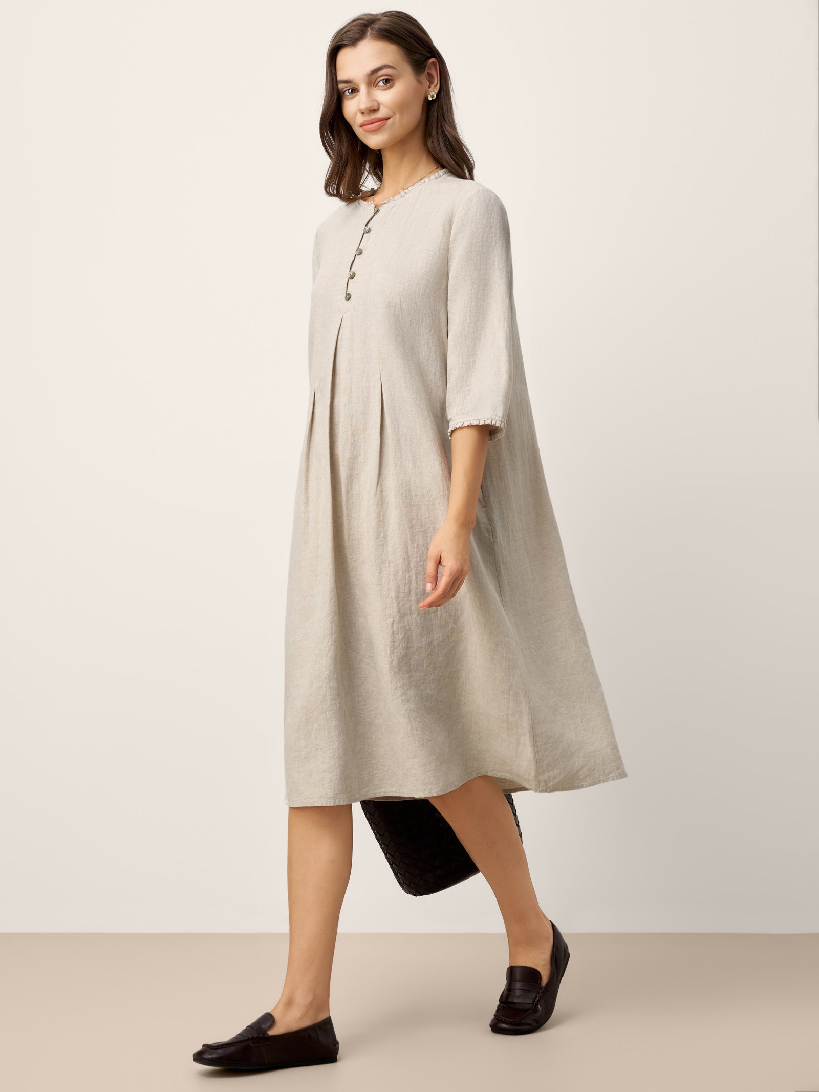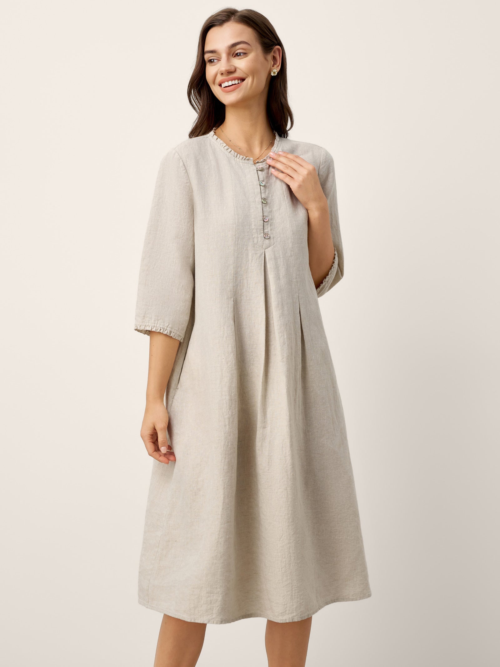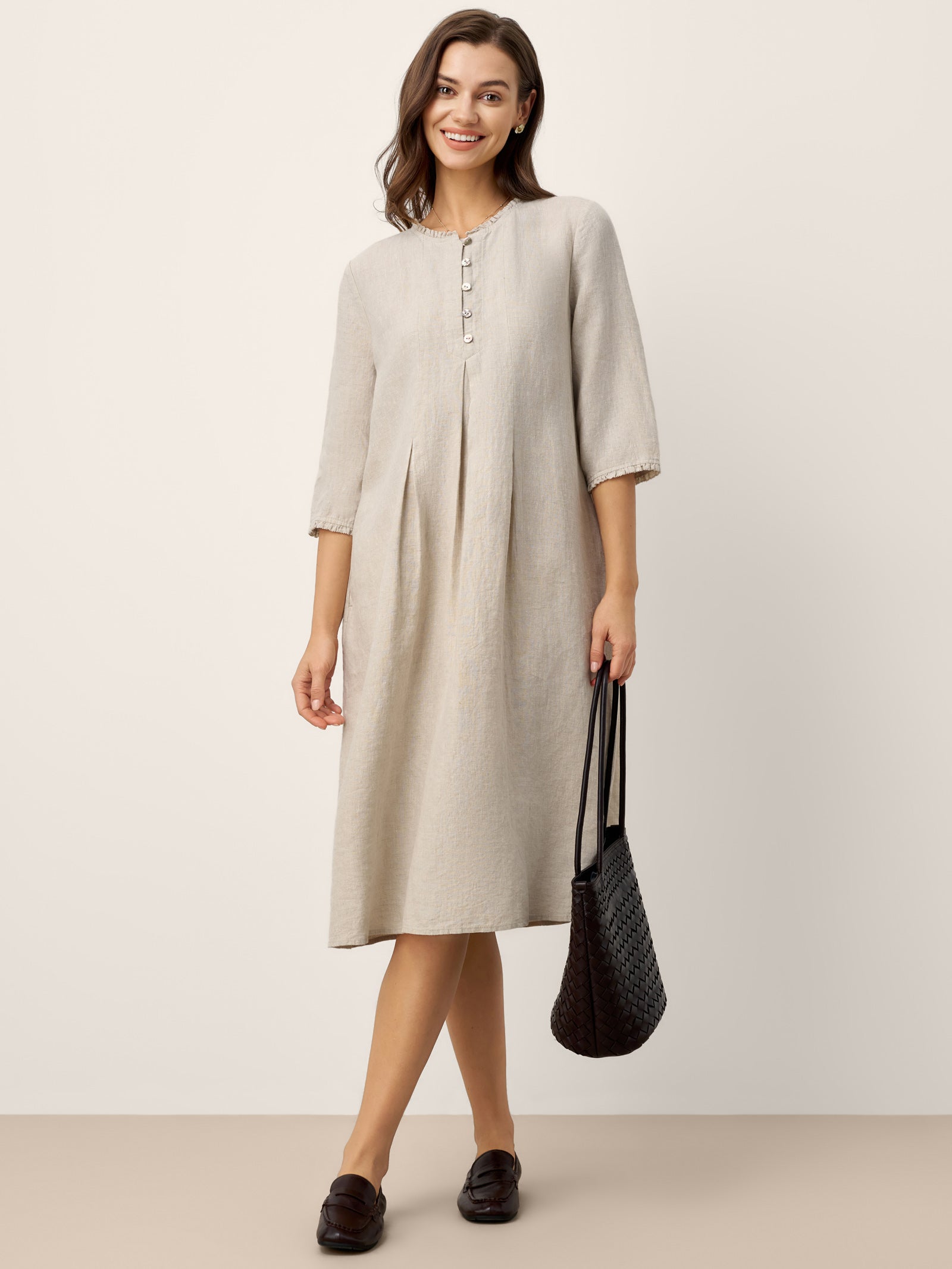 100% Linen Ruffle Trim Inverted Pleat Midi Dress LAVINIA