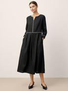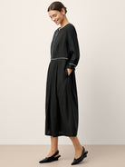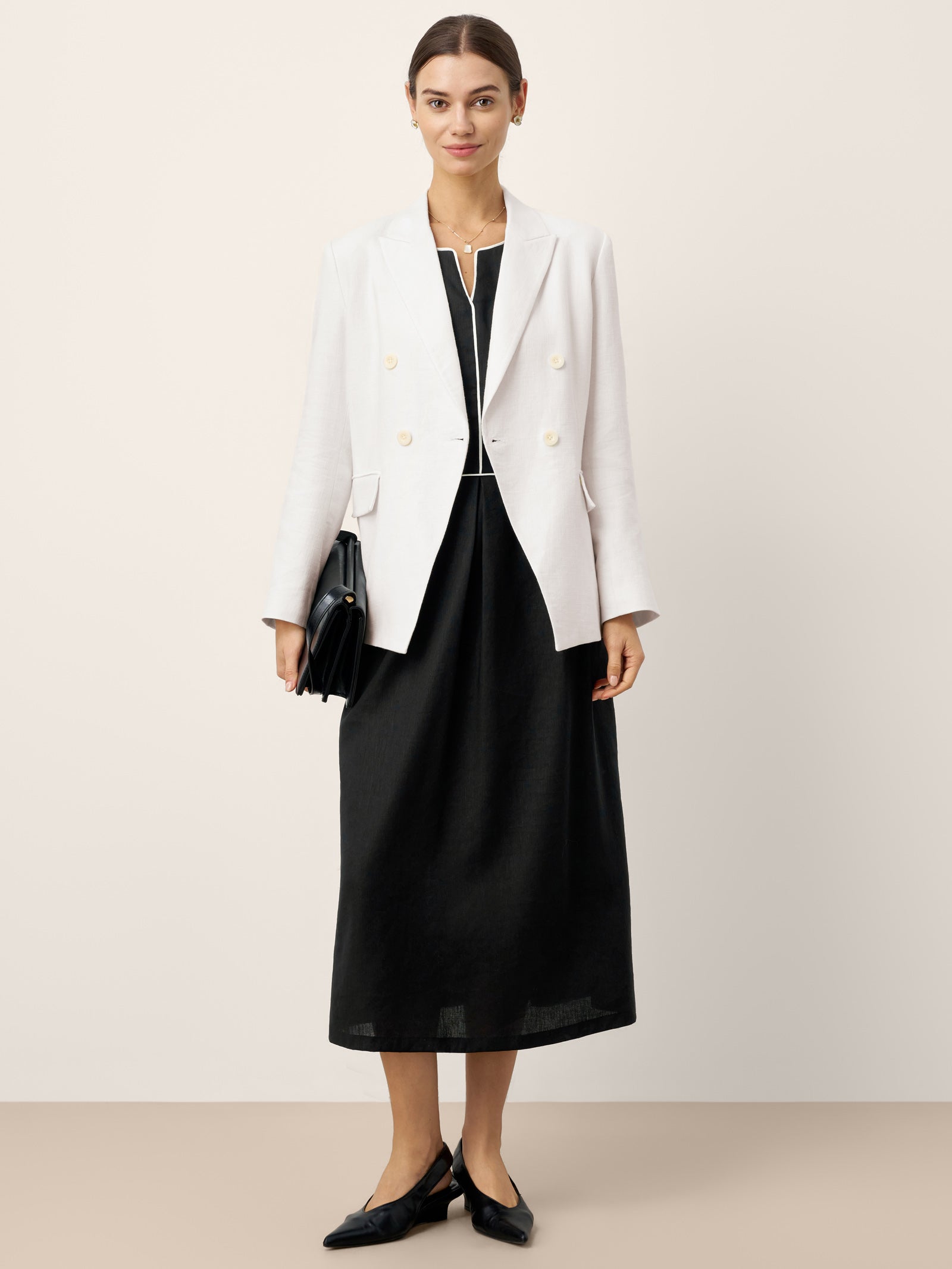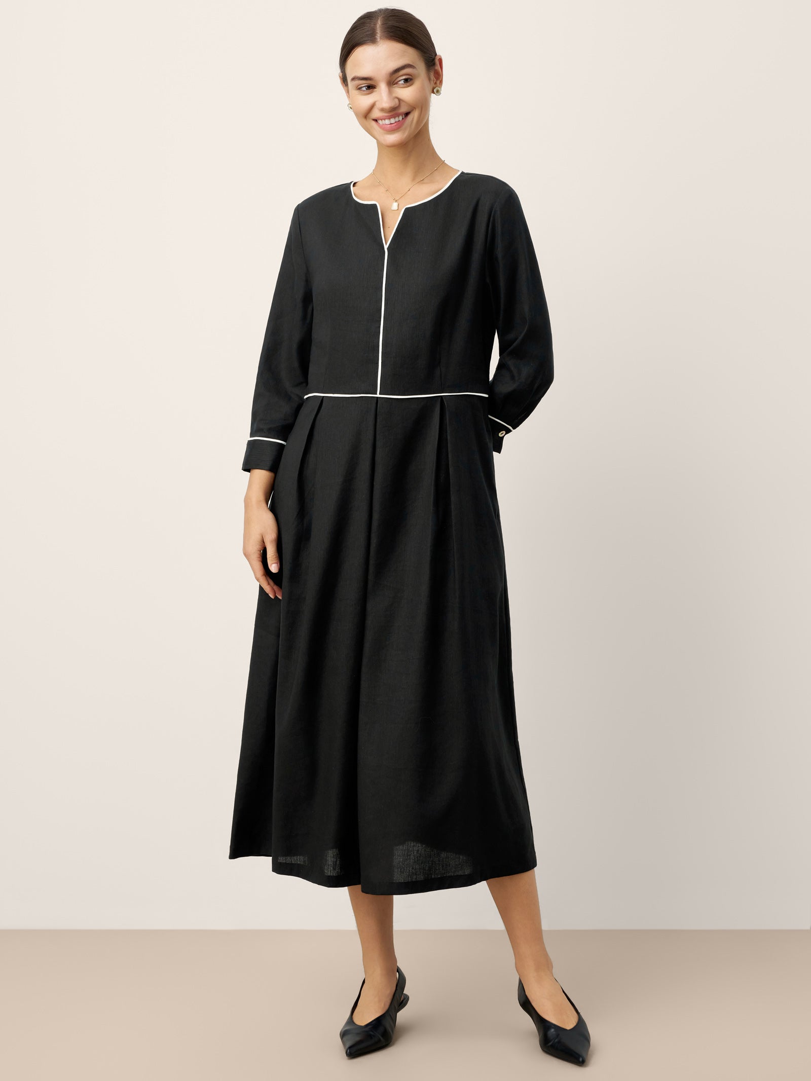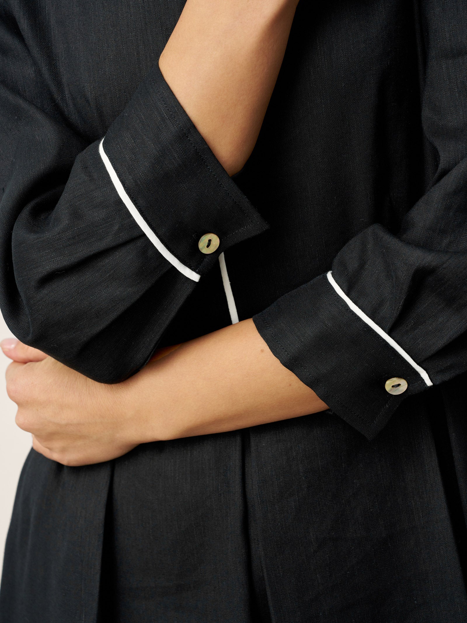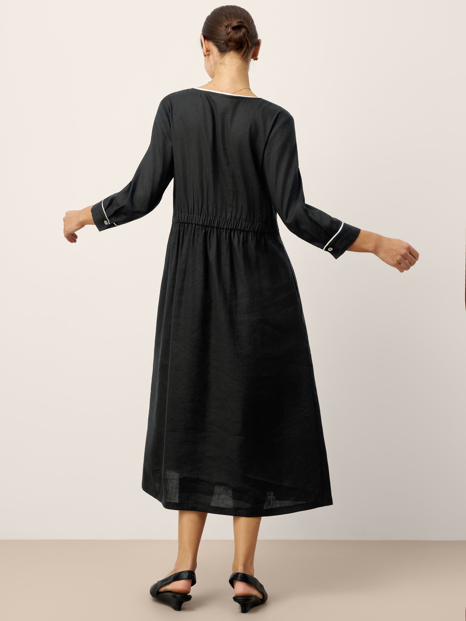 Wrap yourself in sleek midnight elegance. Crisp white trim highlights the V-neck, waist, and cuffs, sculpting a clean, modern silhouette, while the linen-lyocell fabric keeps you light and breezy.