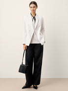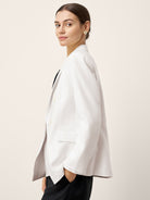Command attention with the IRIS blazer, where breathable linen drapes luxuriously over a sharp crossover silhouette, blending tailored sophistication with breezy comfort for timeless office-to-evening elegance.
