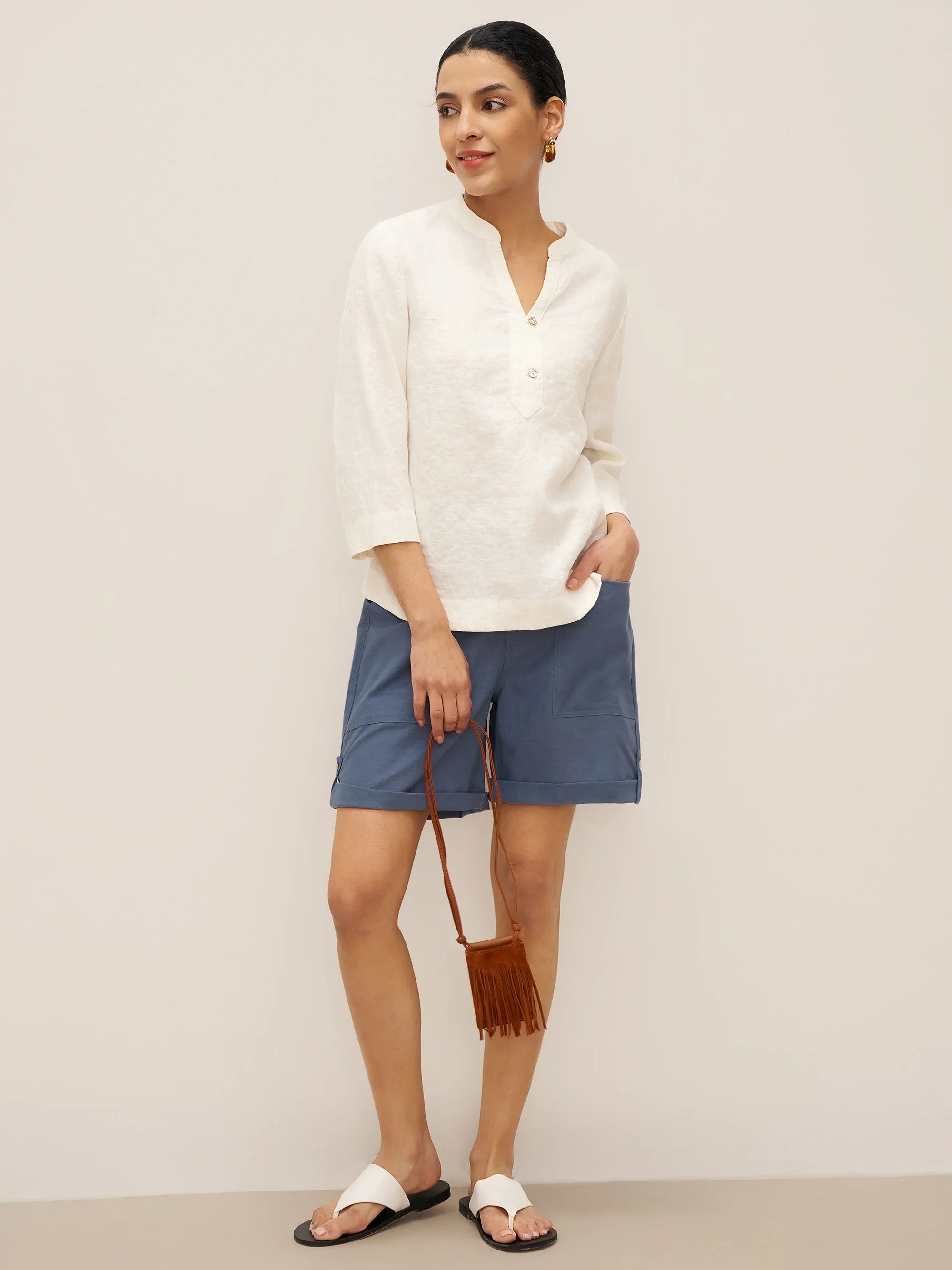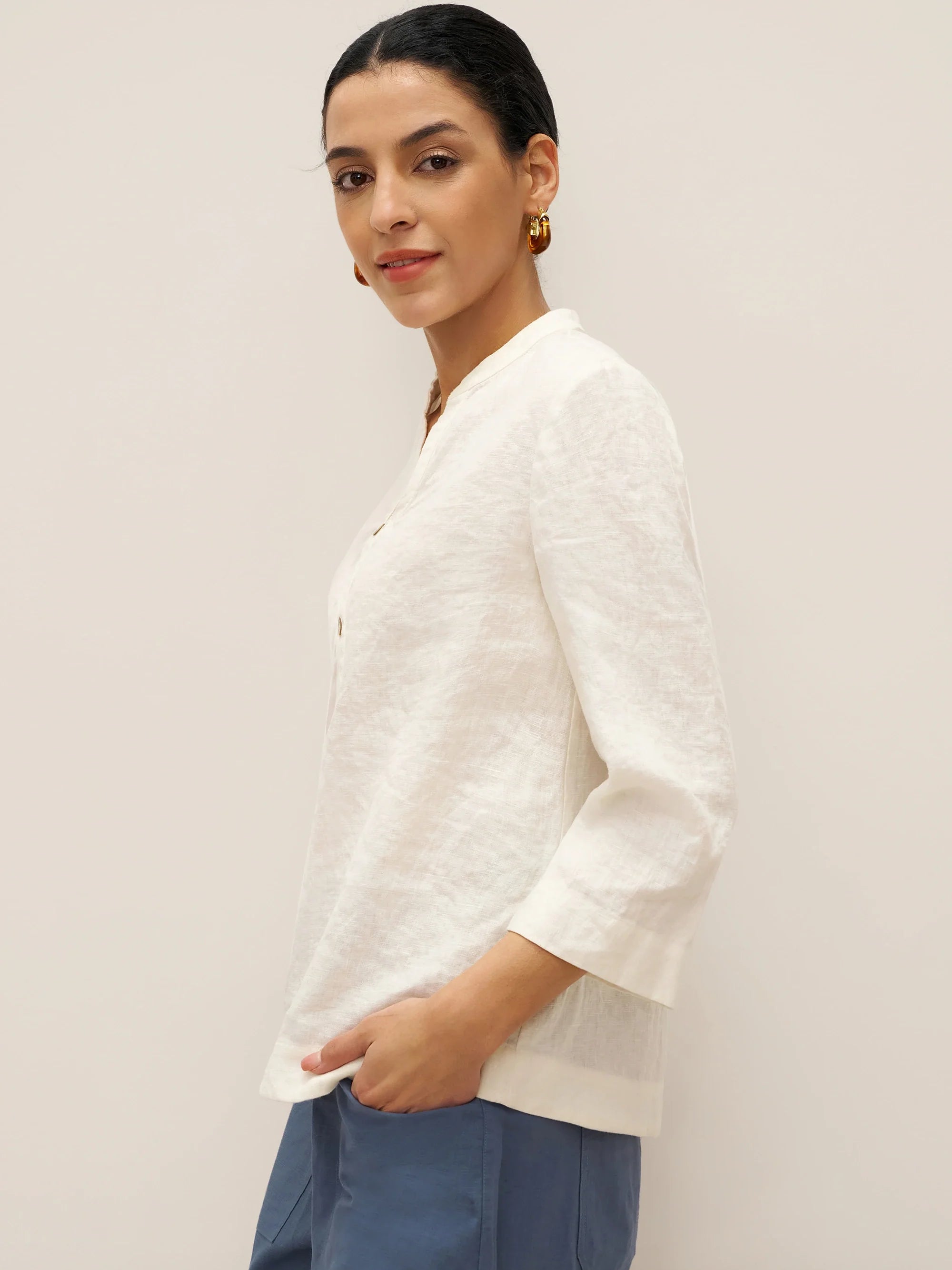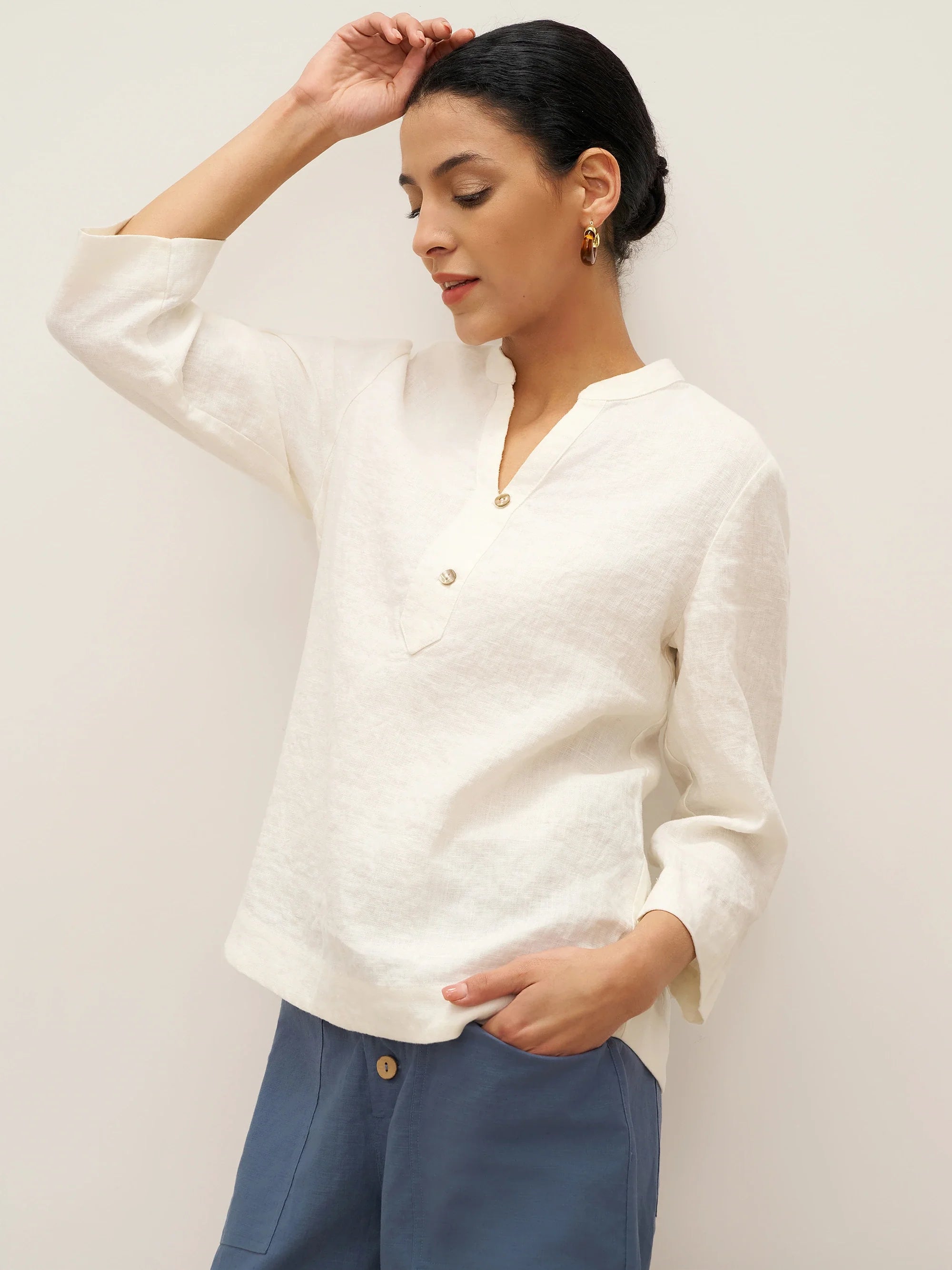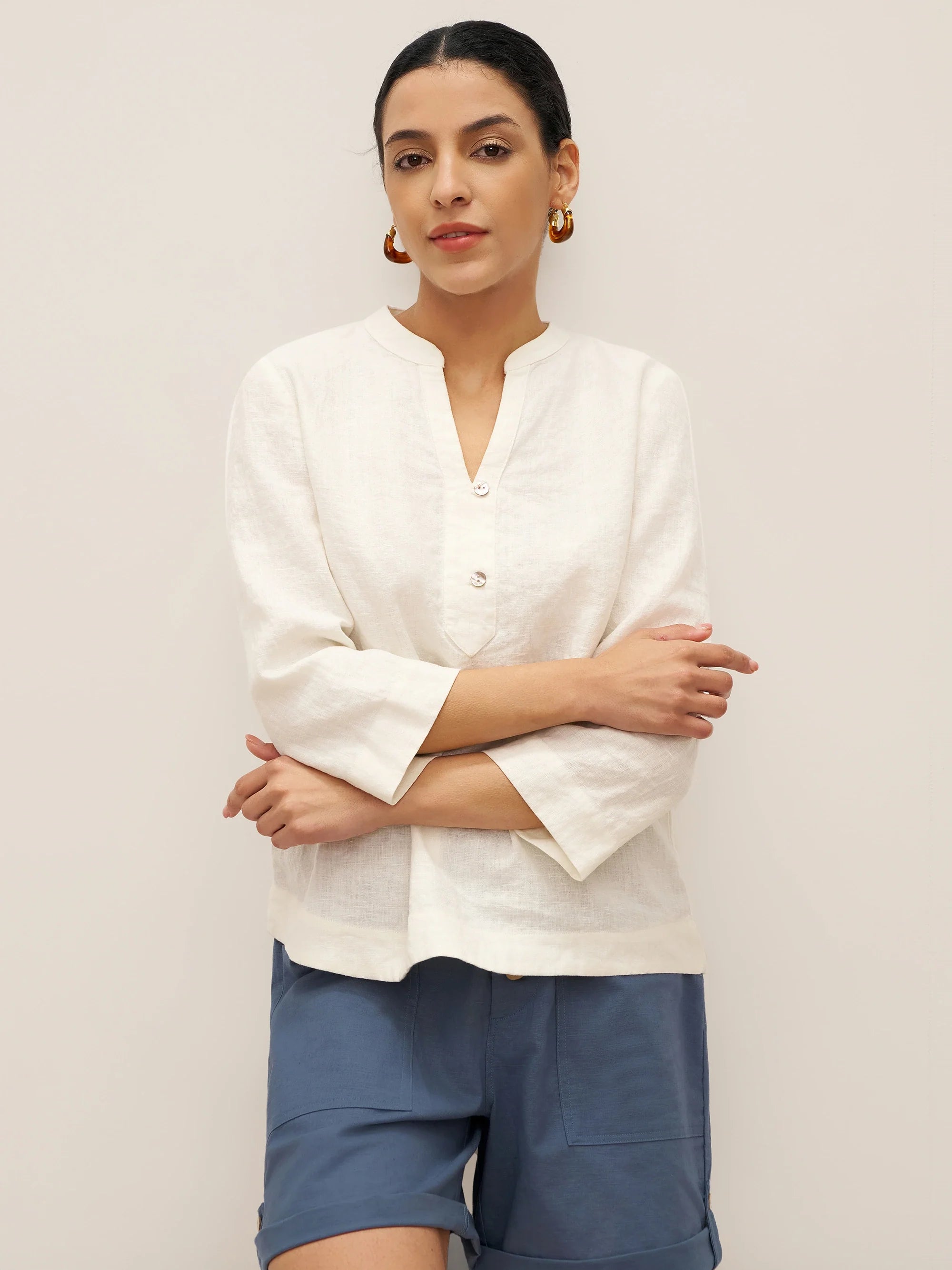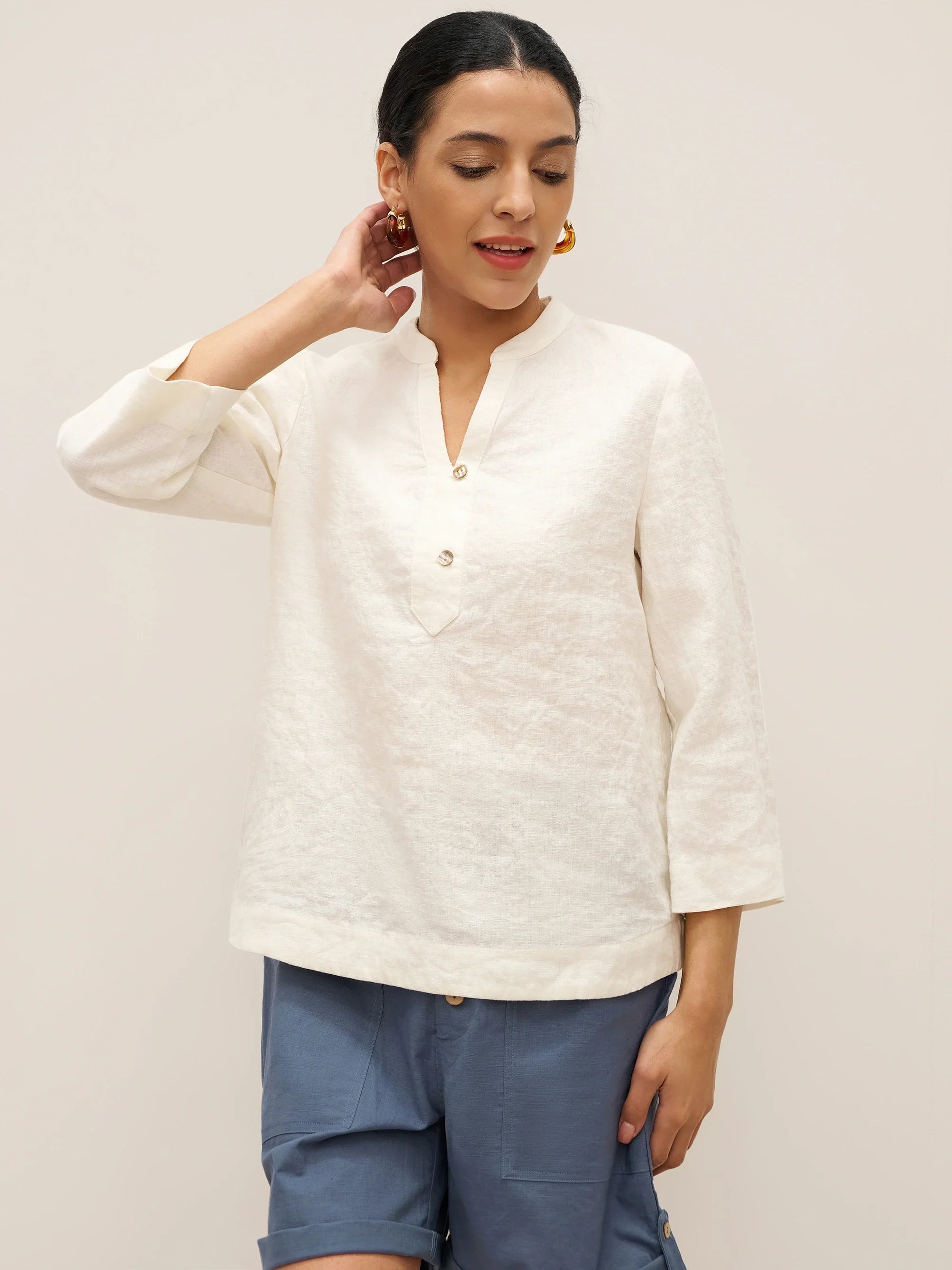 A modern Mandarin-inspired linen top, blending simplicity with elegance. Its clean and refined design adds understated sophistication, perfect for versatile styling.