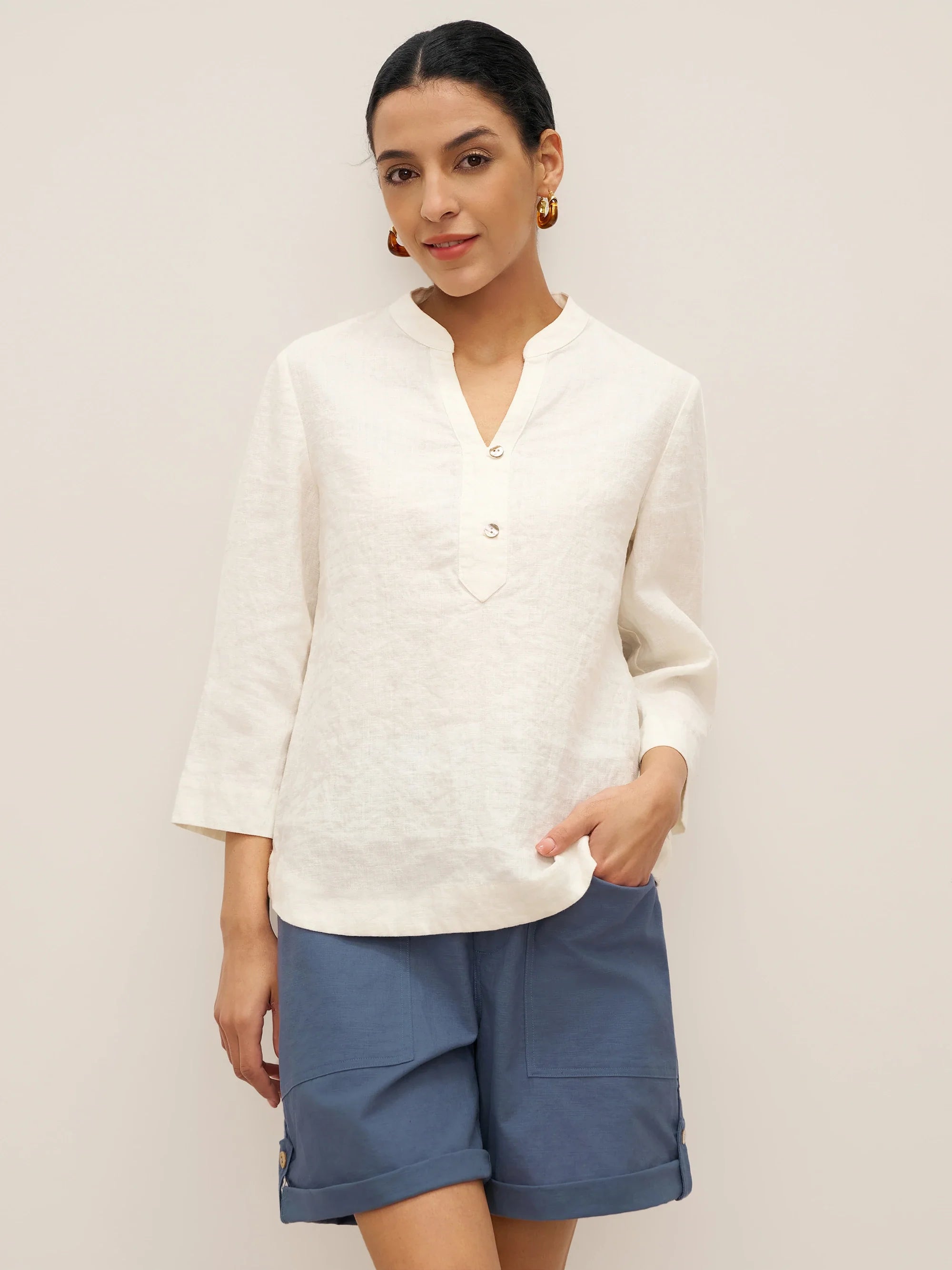 100% Linen Deep V-Neck Pullover with Button-Trim JOLYNE
