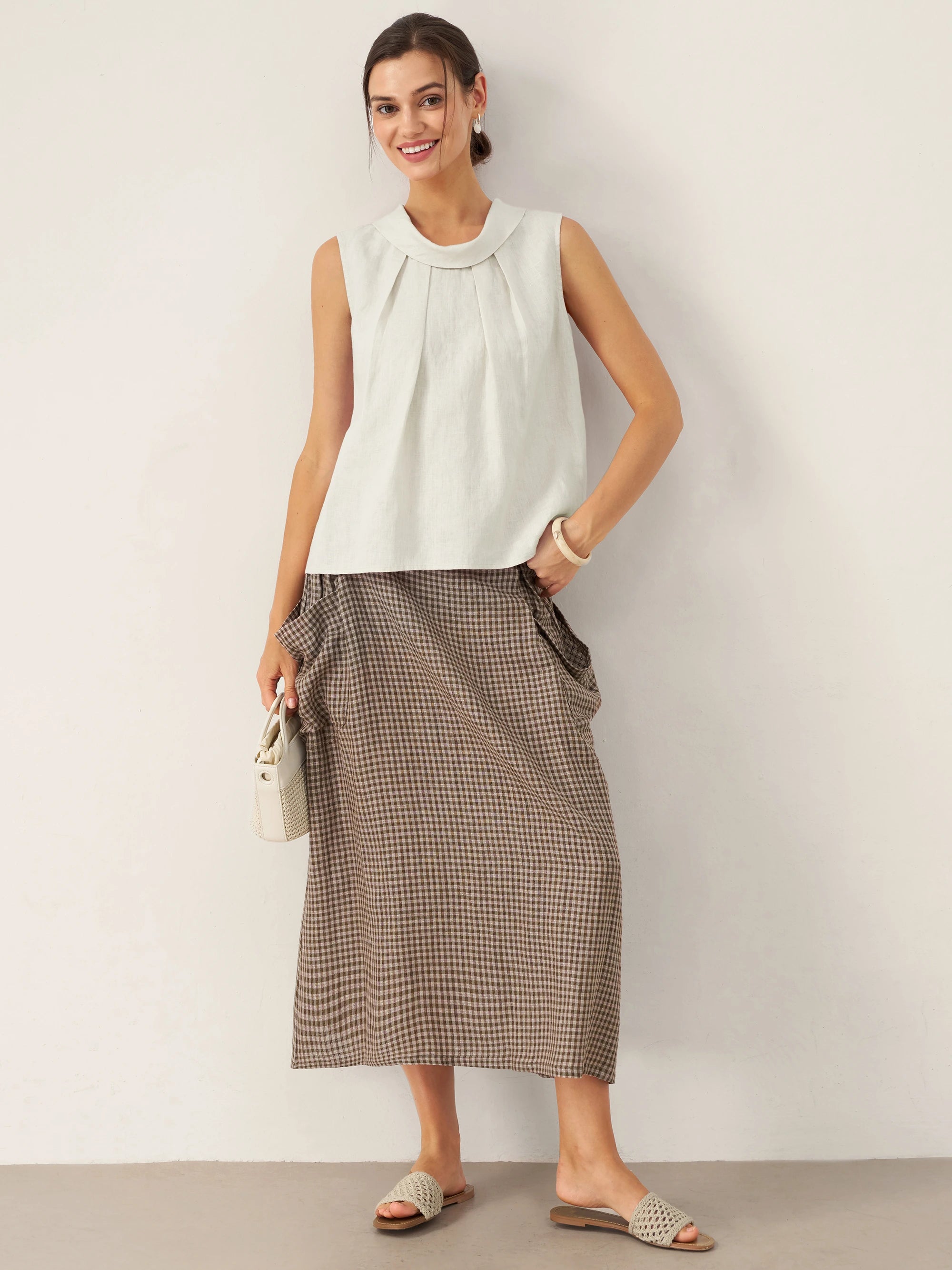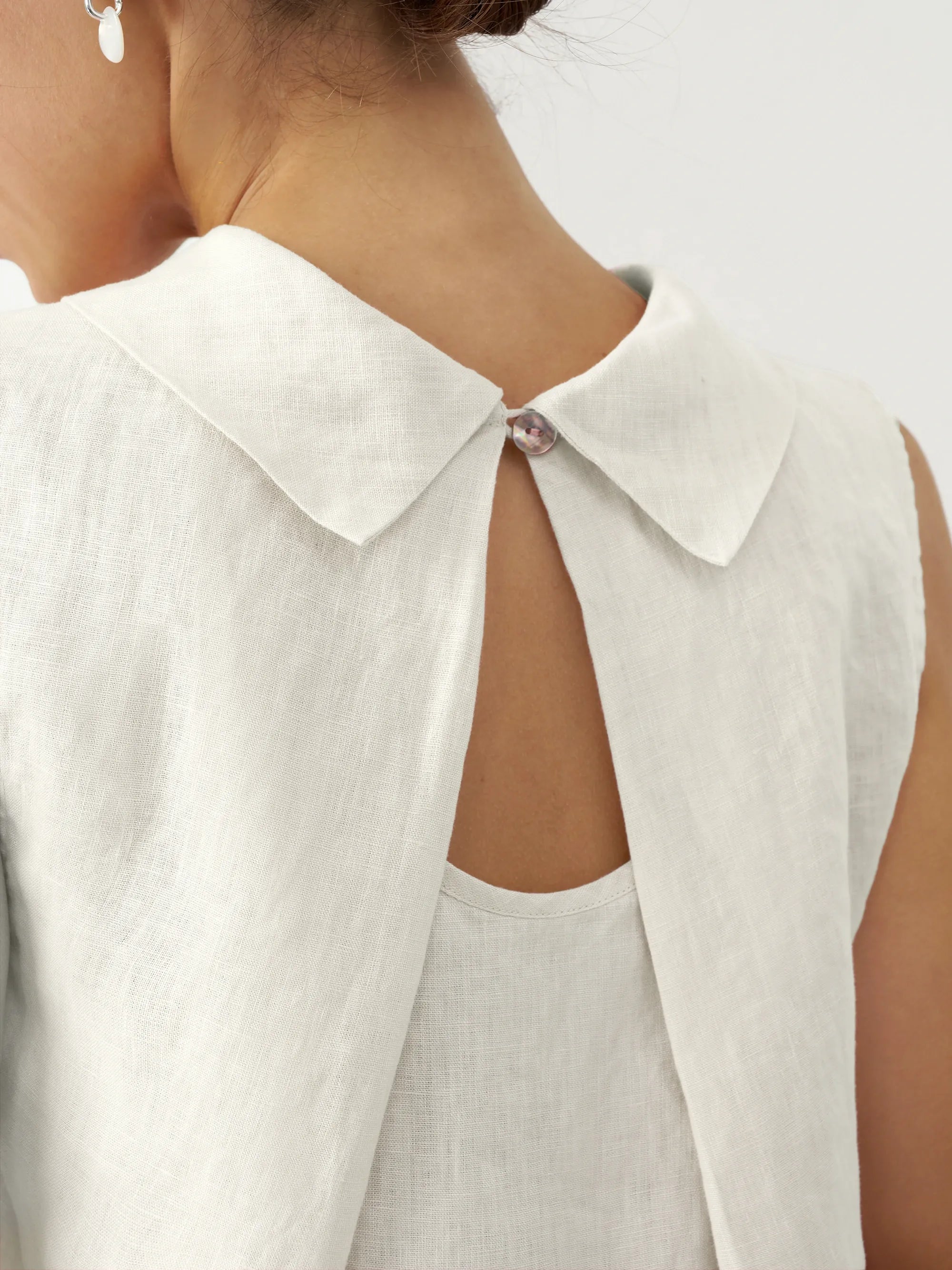 The Sleeveless Top with Stand-up Collar is a stylish and comfortable piece that combines classic elements with modern design.