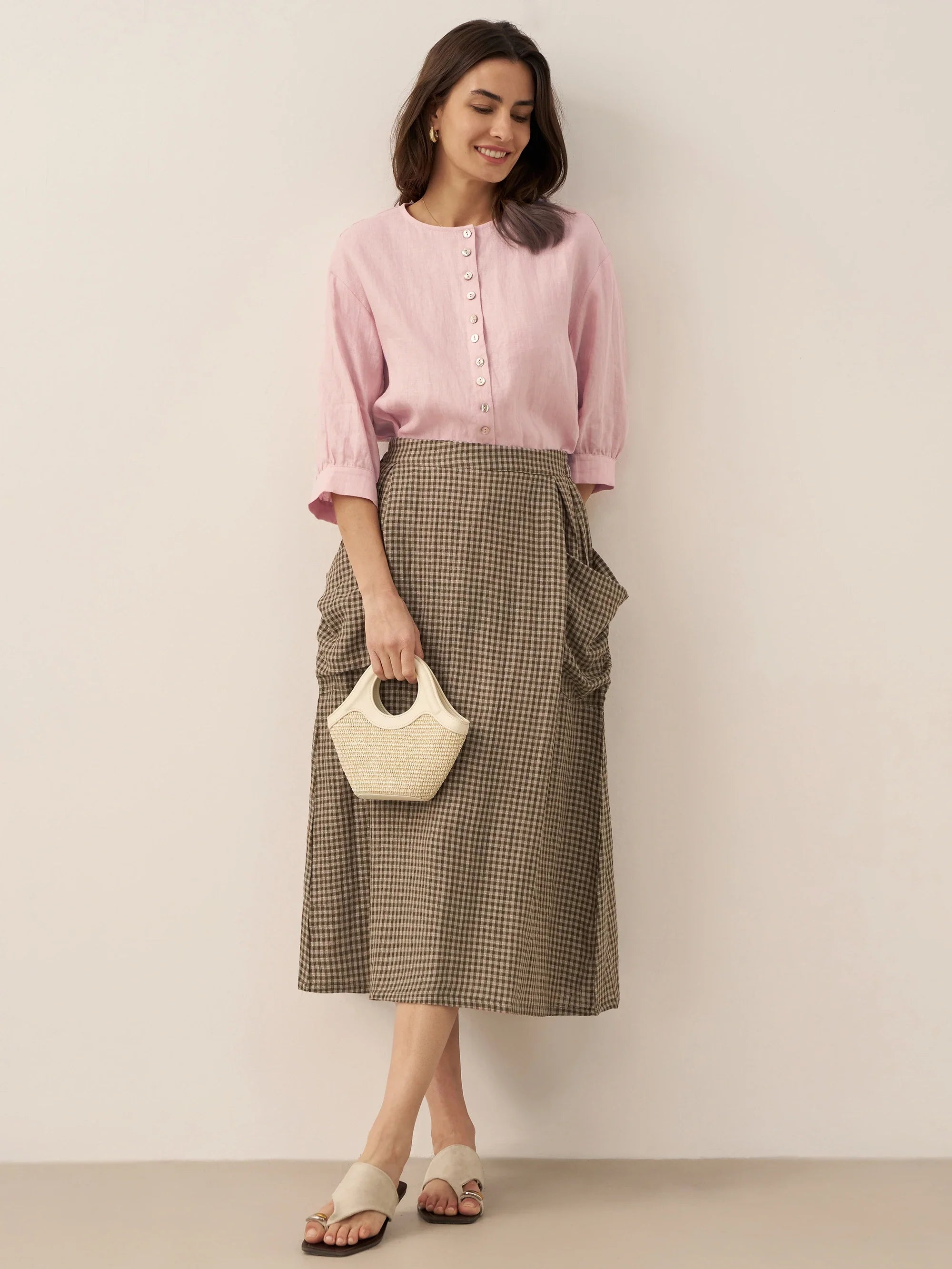 Linen Checked Elastic Waist Skirt