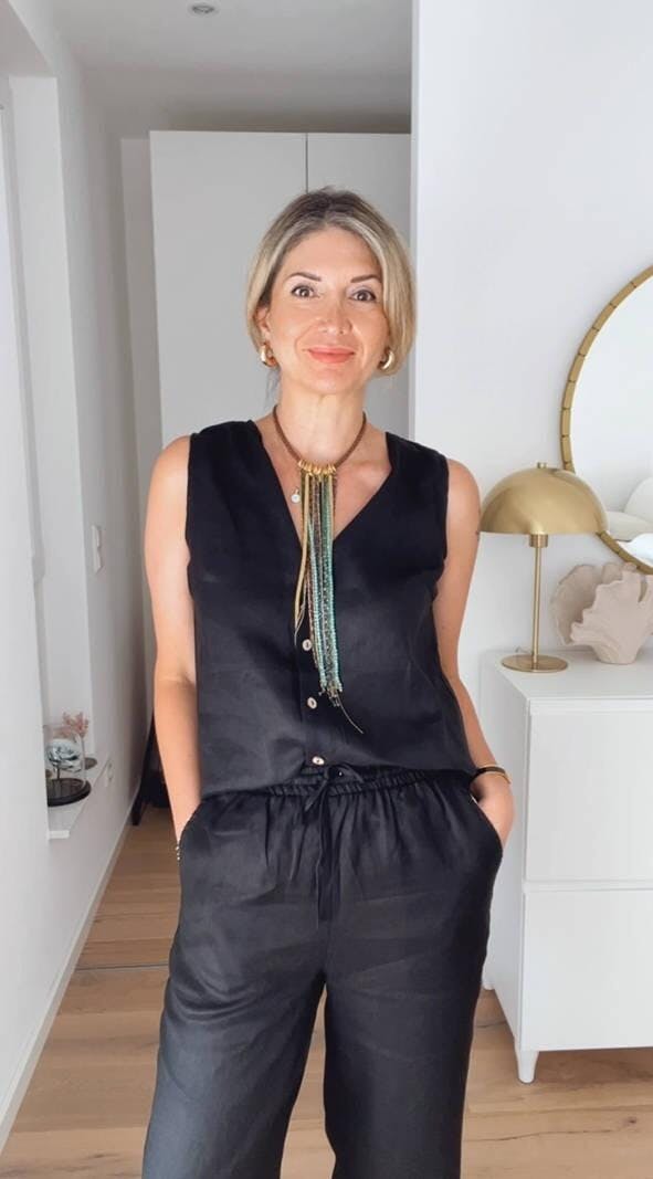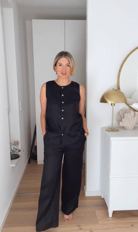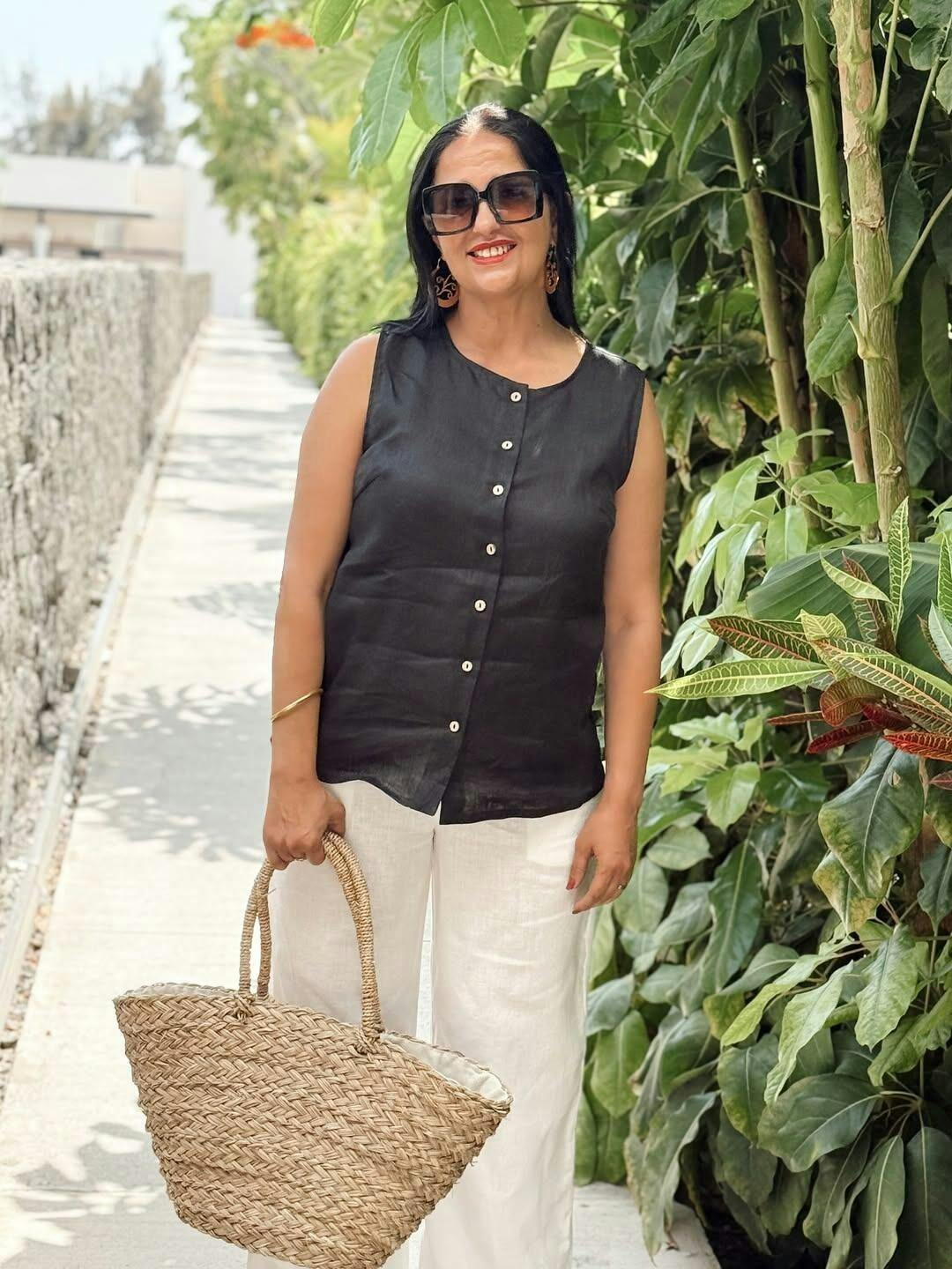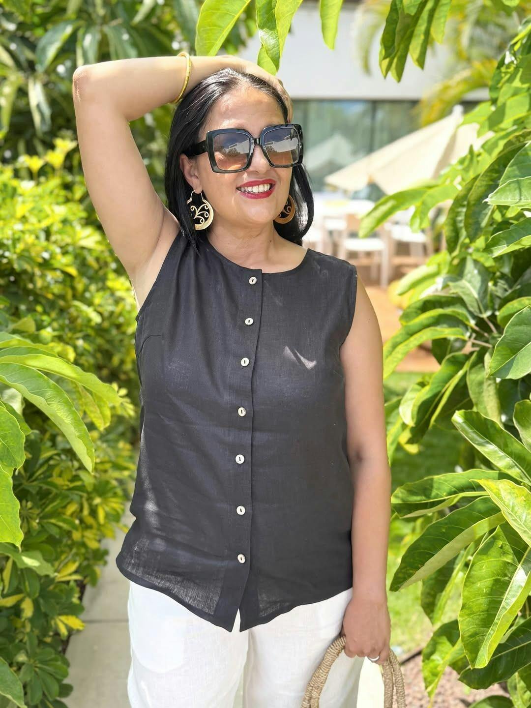 • Elevate your summer with this sleek, sleeveless linen top. A chic row of buttons adds sophistication, making it your go-to for cool, minimalist style.