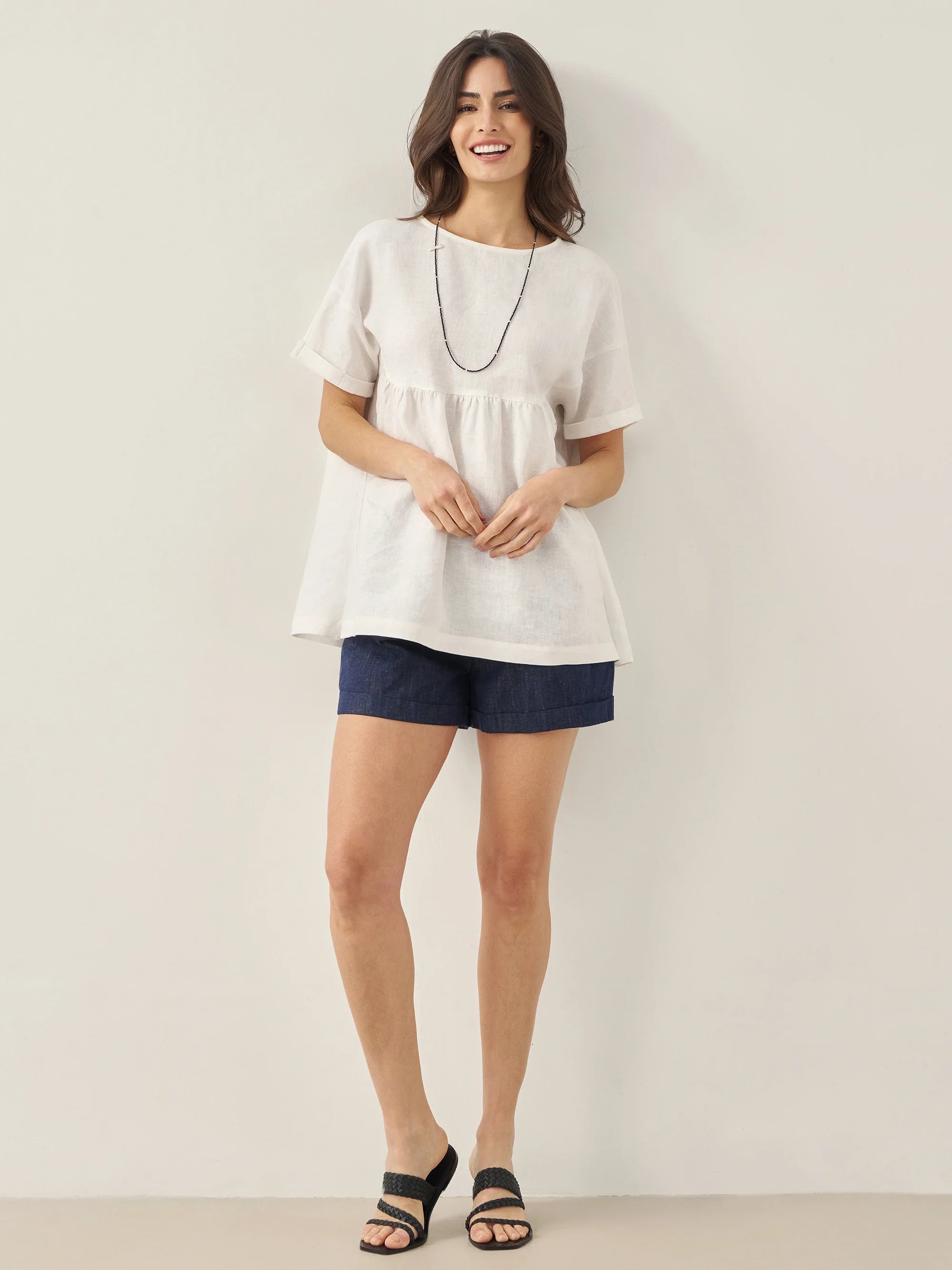 - The short drop shoulder sleeves, paired with naturally rolled sleeve edges, add a laid-back touch and highlight the subtle design details.