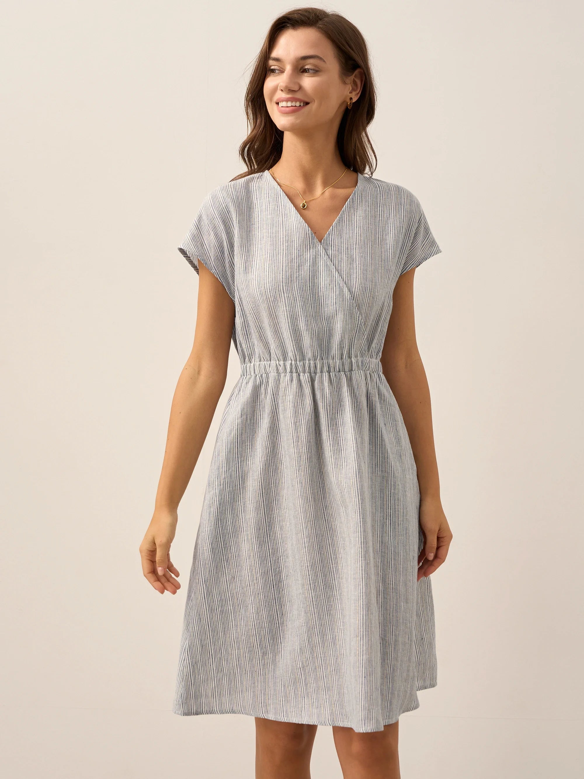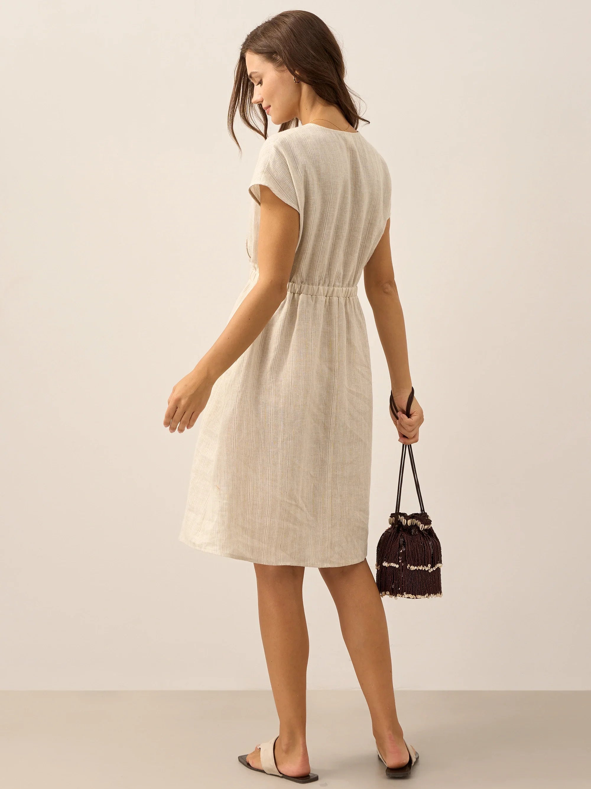100% Linen Striped Elastic-Waist Midi Dress ARIA