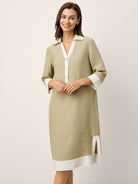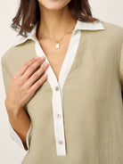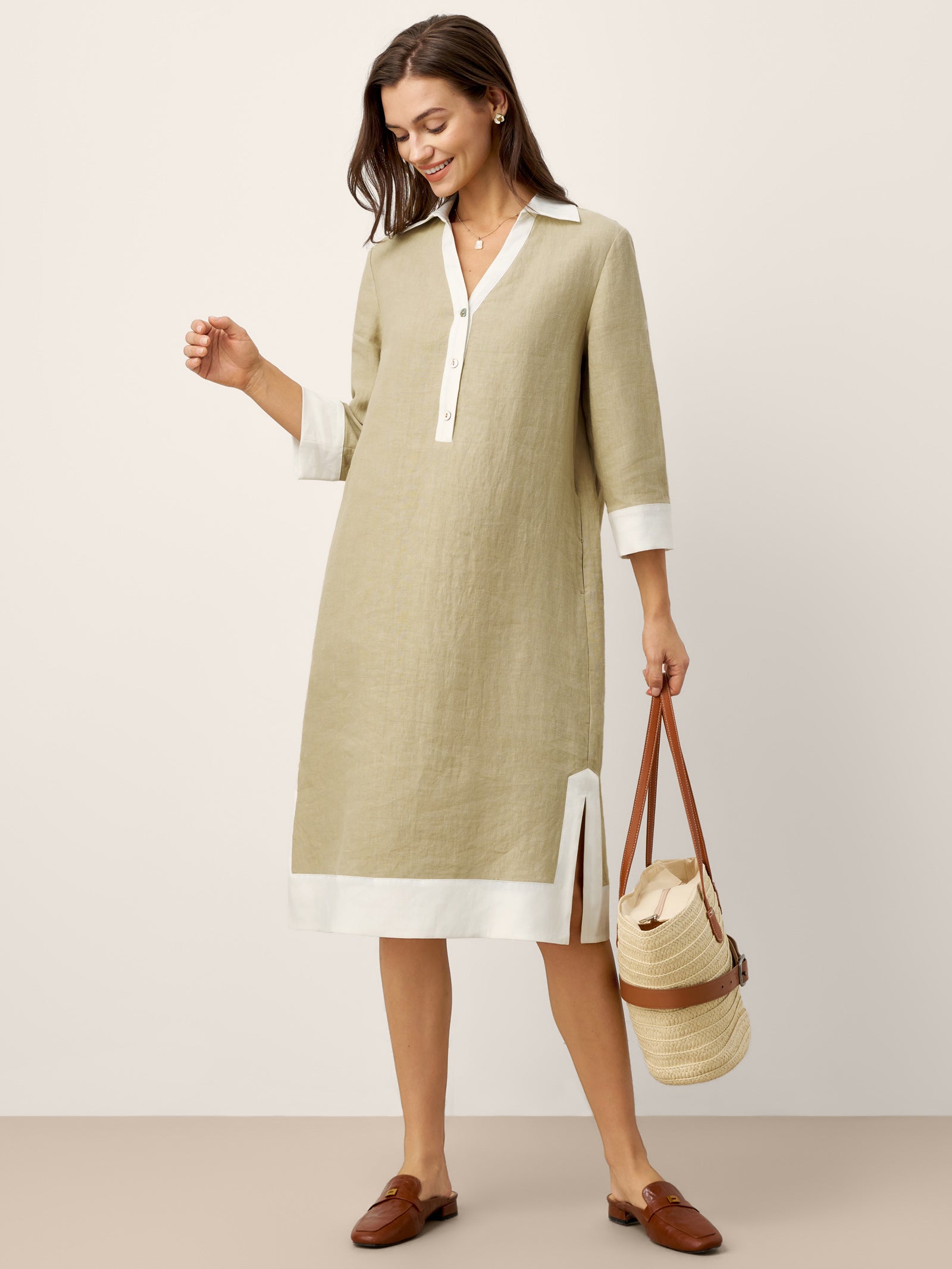 Lightweight linen flows over your figure in elegant ease, accented by crisp white trim and a V-placket neckline that sculpts and flatters.