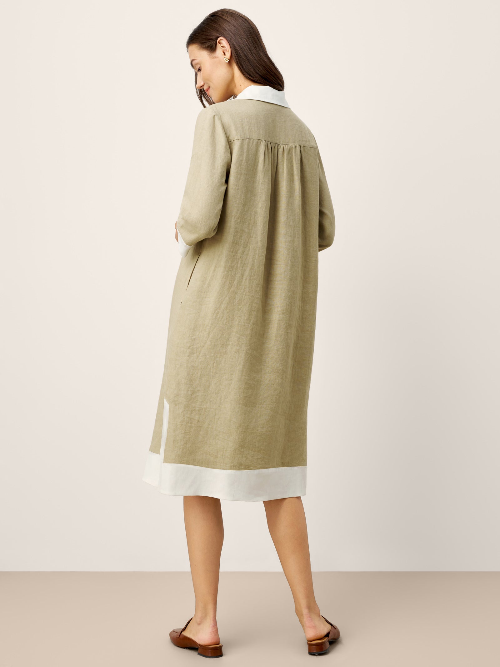 100% Linen Contrast Panel V-neck Layered Lapel Midi Shirt Dress PERSEPHONE