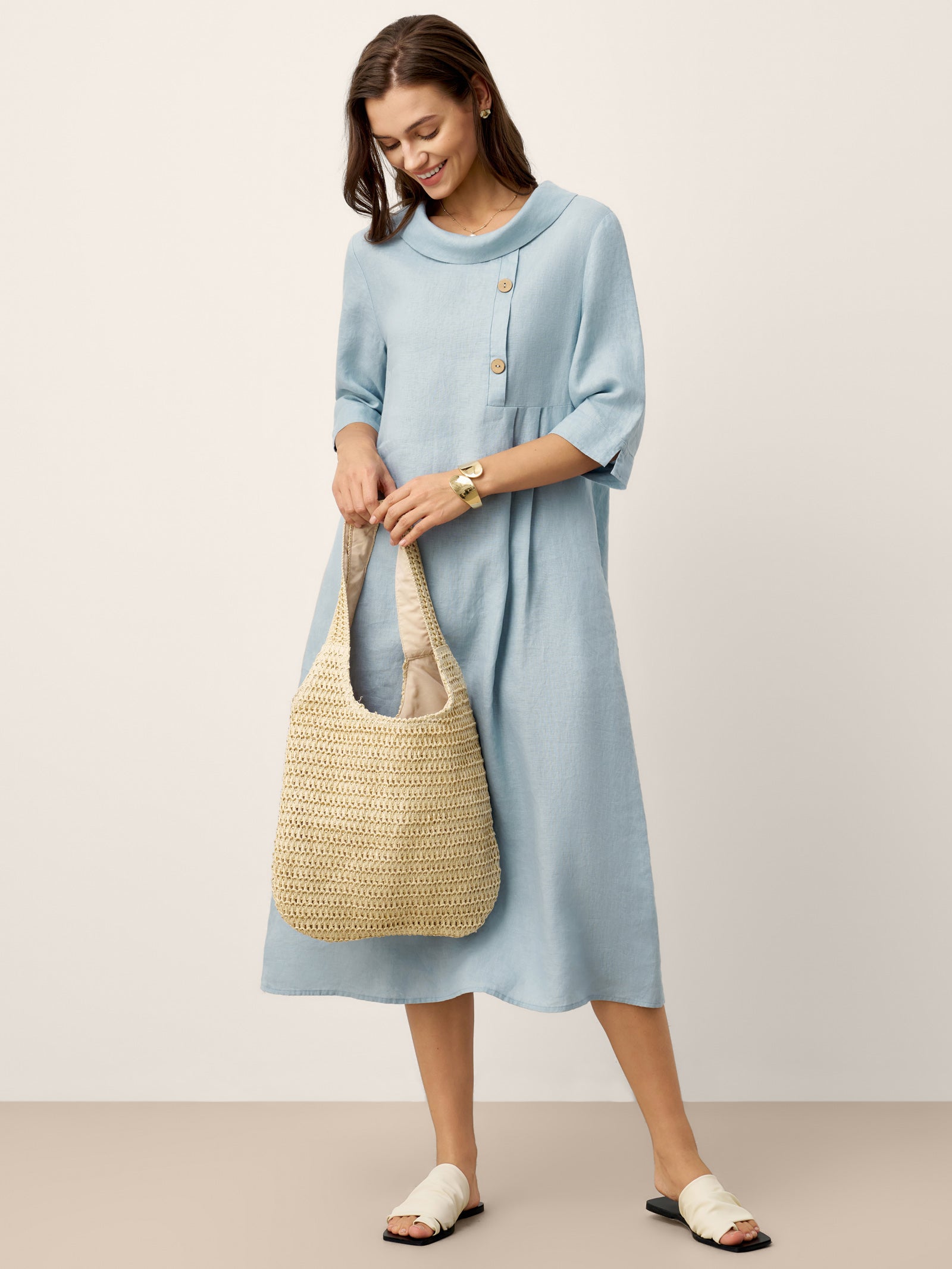 The ELARAINE Linen Maxi Dress combines breathable 100% linen with a sculpting rolled collar and asymmetric pleats, offering a comfortable, flattering silhouette and functional details for versatile wear.
