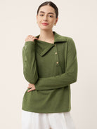 A wool long overtops in olive featuring an asymmetric lapel and natural fruit button accents, designed with a tailored silhouette for refined elegance and versatile wearability.