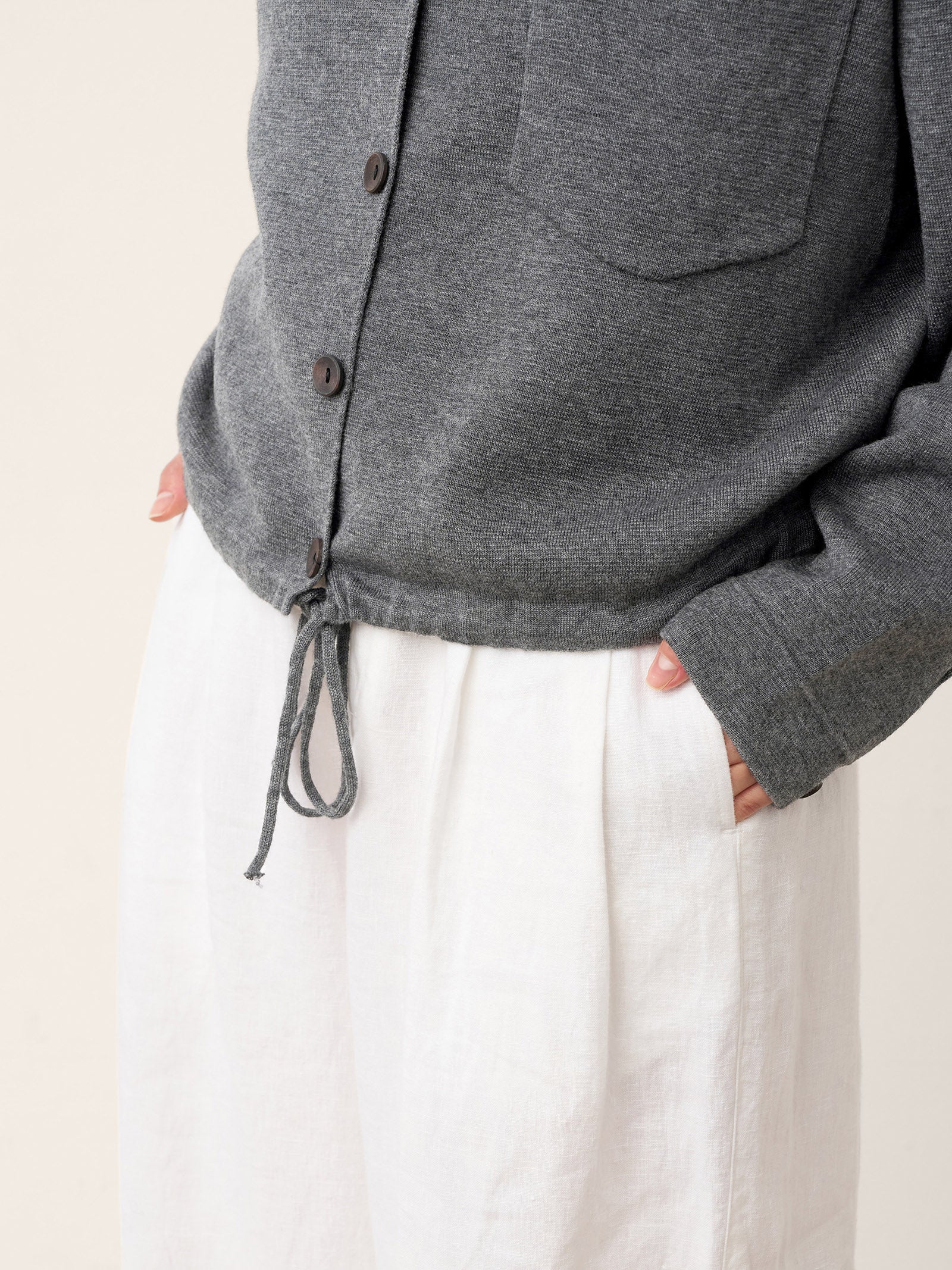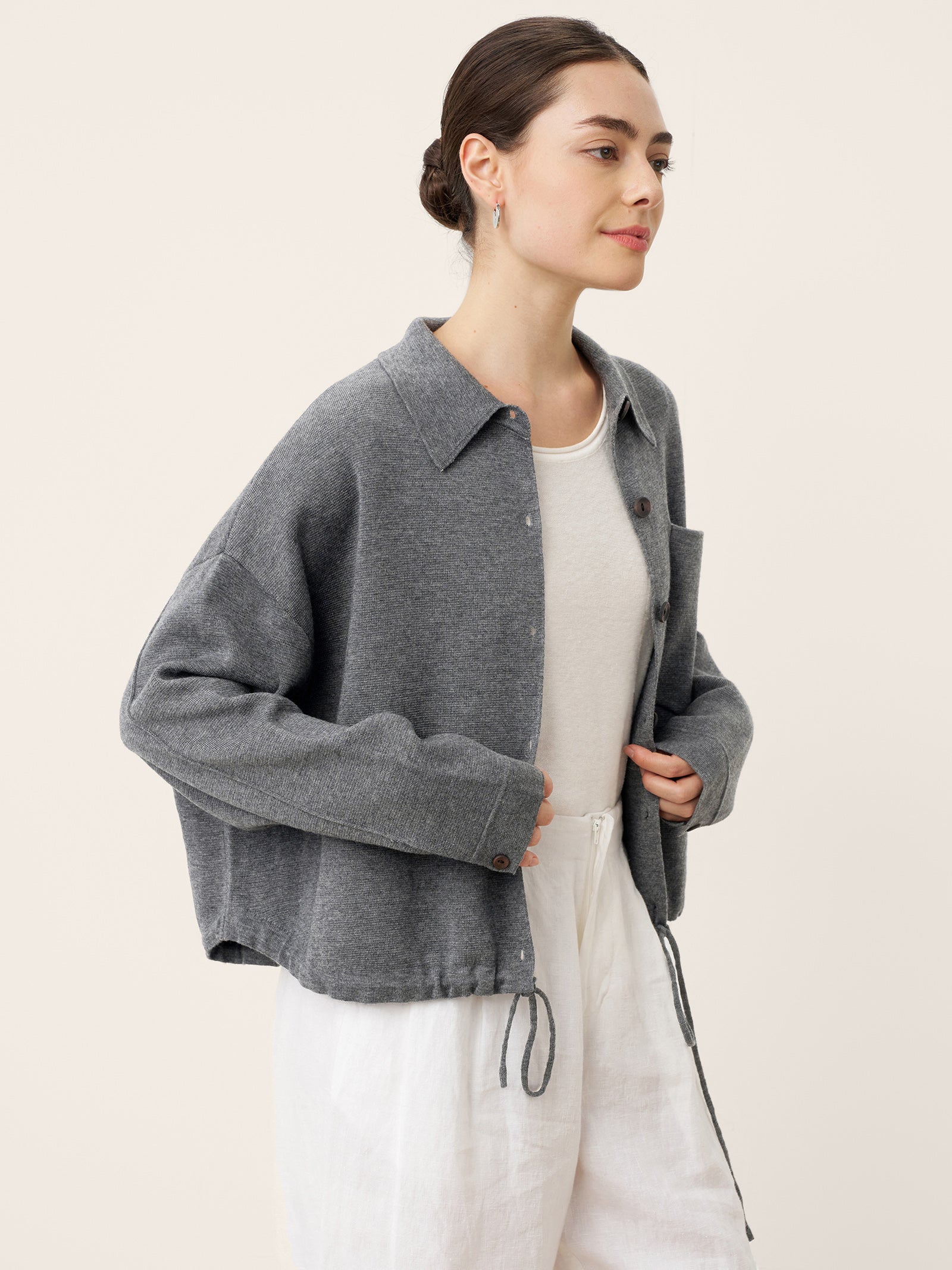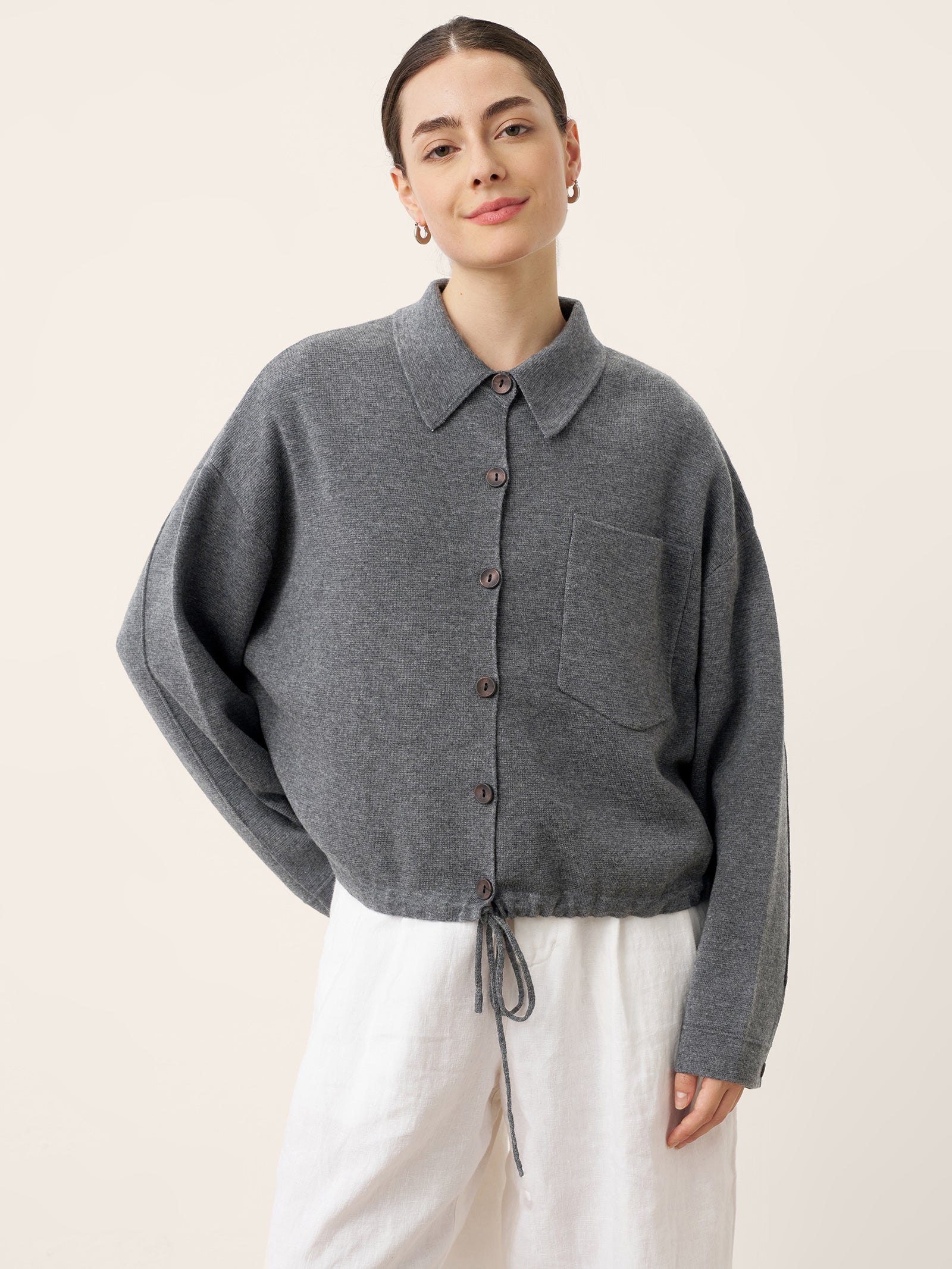 A charcoal grey embrace of structure meets softness, where the crisp shirting collar frames relaxed drape and a clever drawstring waist offers tailored versatility. This knit jacket redefines smart-casual with its pillowy comfort and adaptable silhouette.