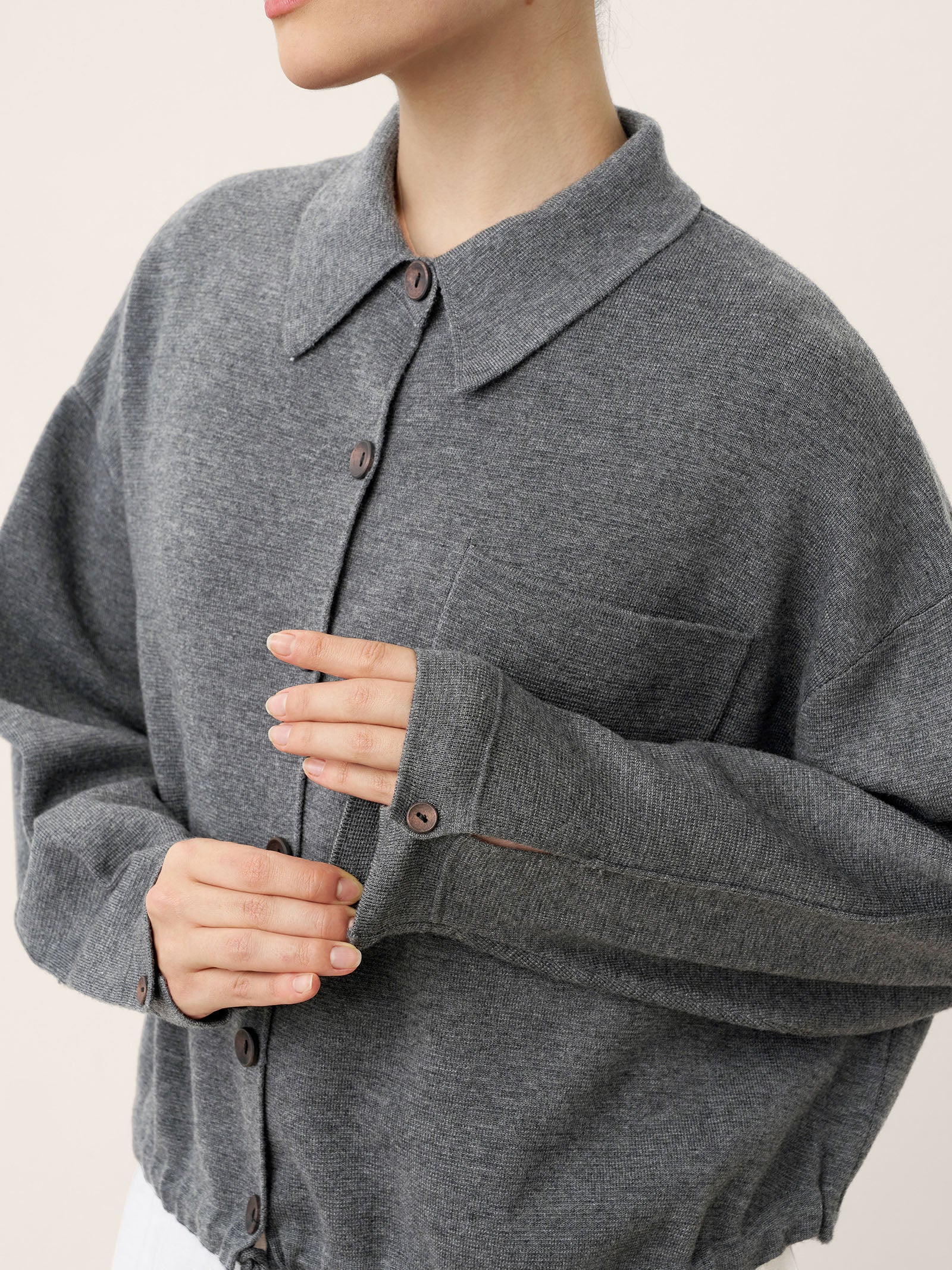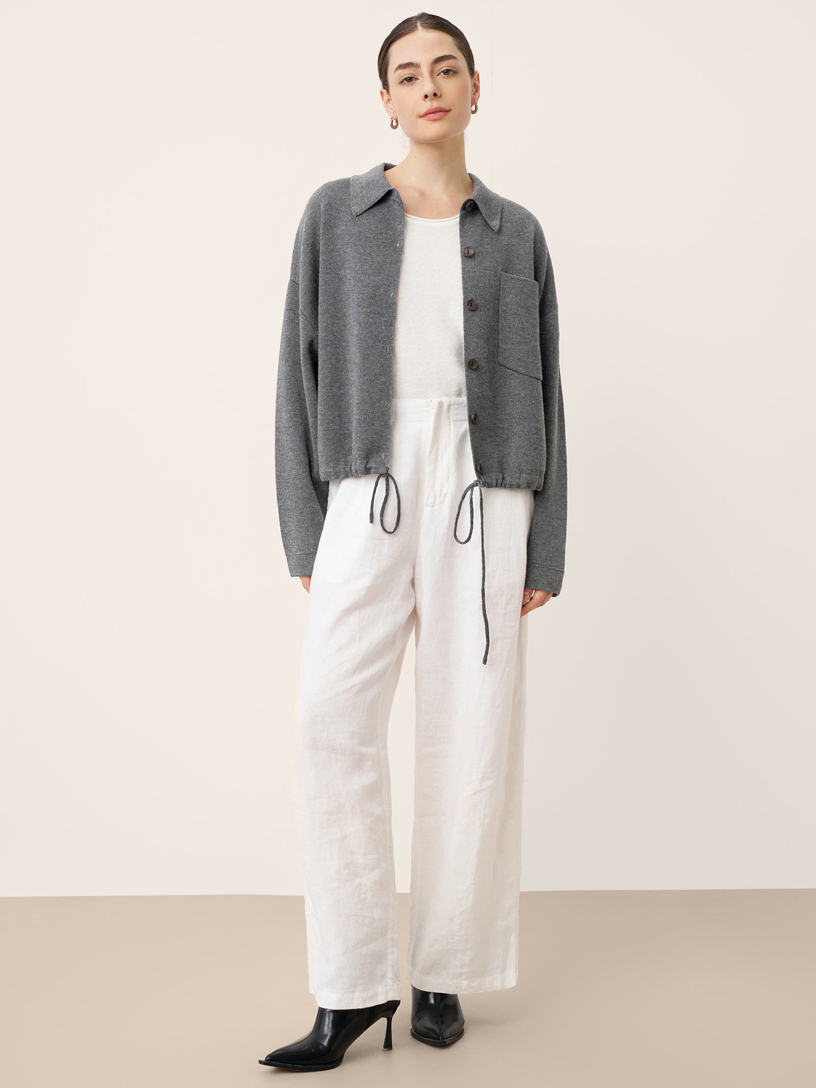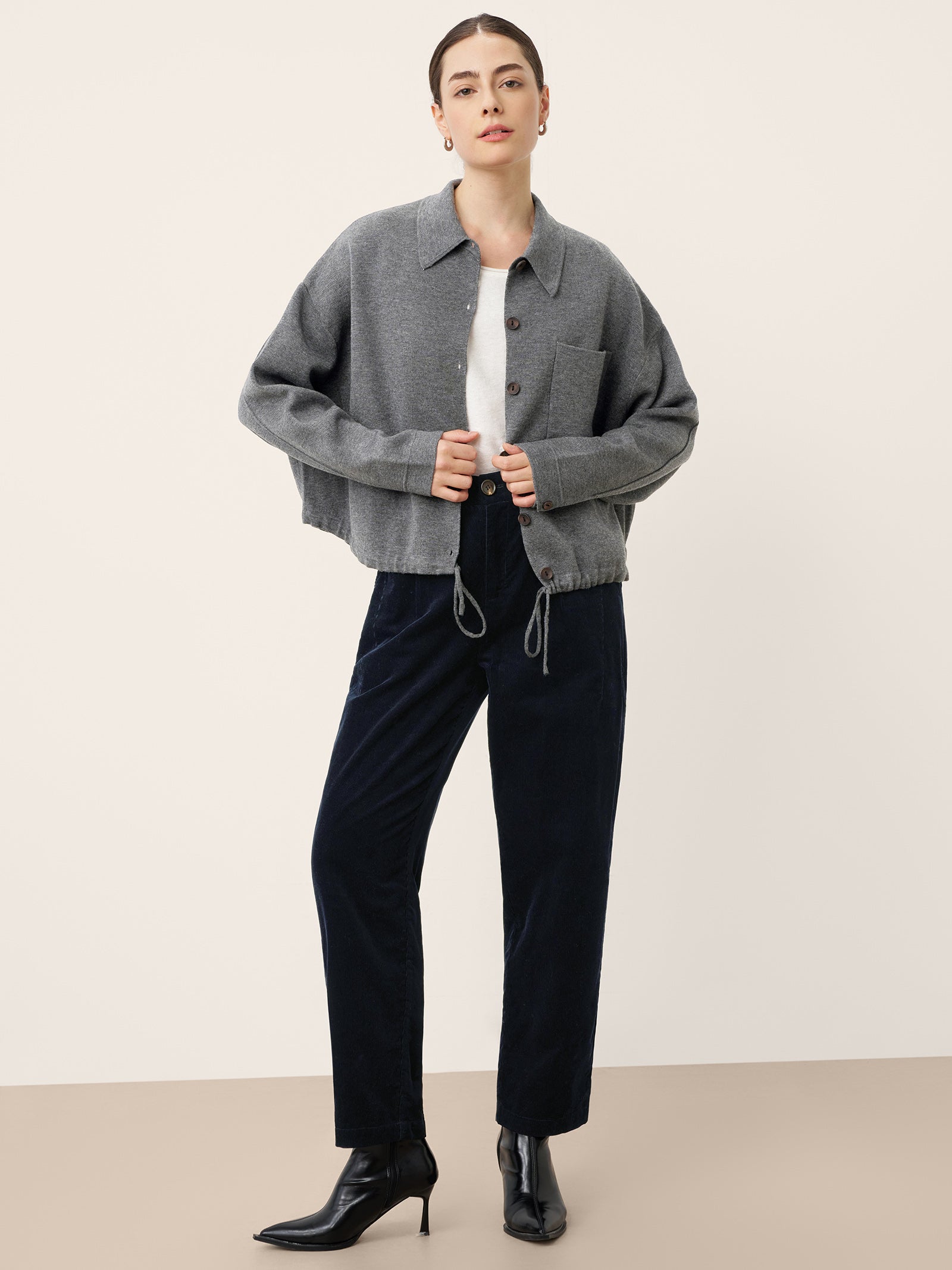 A charcoal grey embrace of structure meets softness, where the crisp shirting collar frames relaxed drape and a clever drawstring waist offers tailored versatility. This knit jacket redefines smart-casual with its pillowy comfort and adaptable silhouette.